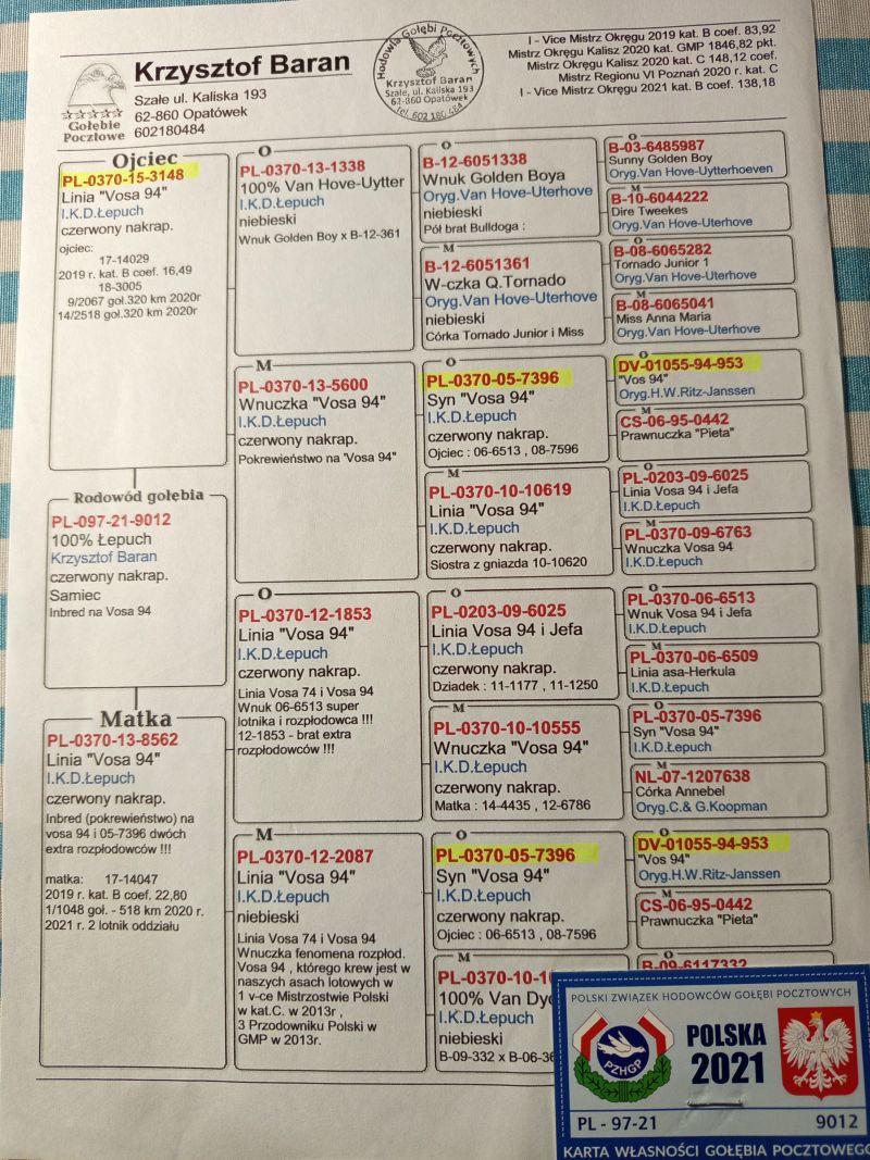 Oryginalny gołąb z hodowli Krzysztofa Barana. Szczegóły pochodzenia w rodowodzie. Więcej informacji pod nr tel.: 602180484 *Odbiór gołębia osobisty lub kurier na własną rękę. Miejscowość Kalisz