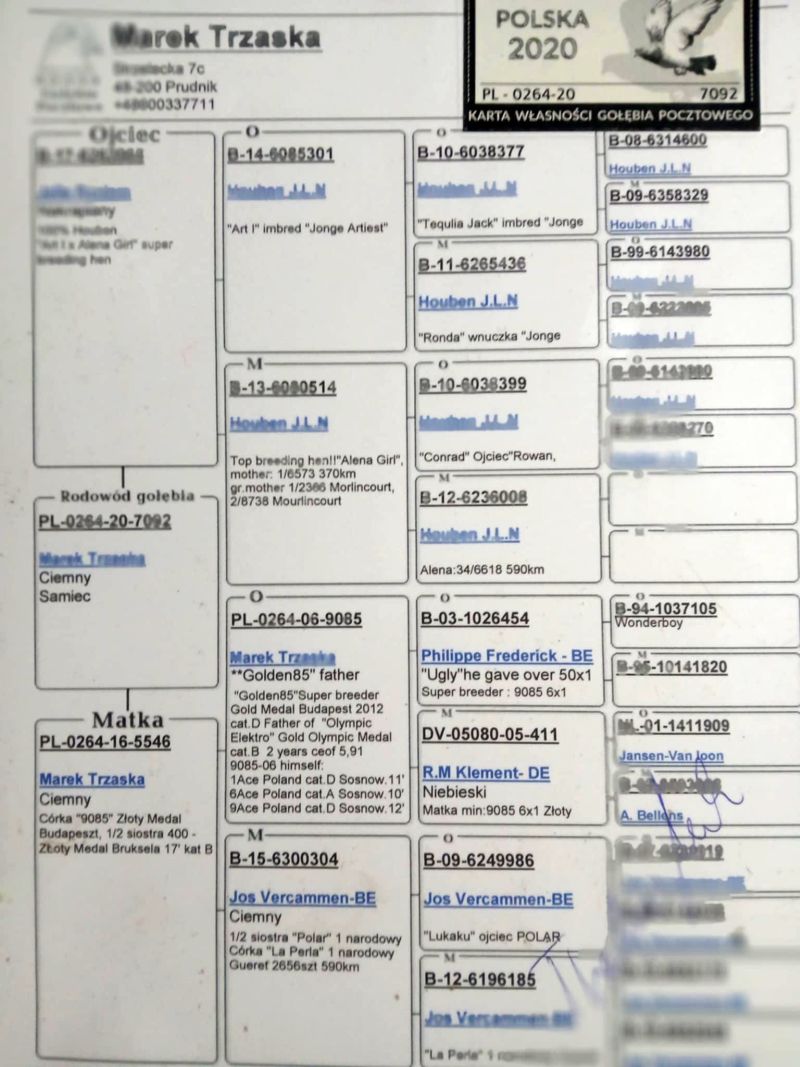 Oryginalny gołąb z hodowli Marka Trzaski. Szczegóły pochodzenia w rodowodzie. Więcej informacji pod nr tel.: 665 599 689