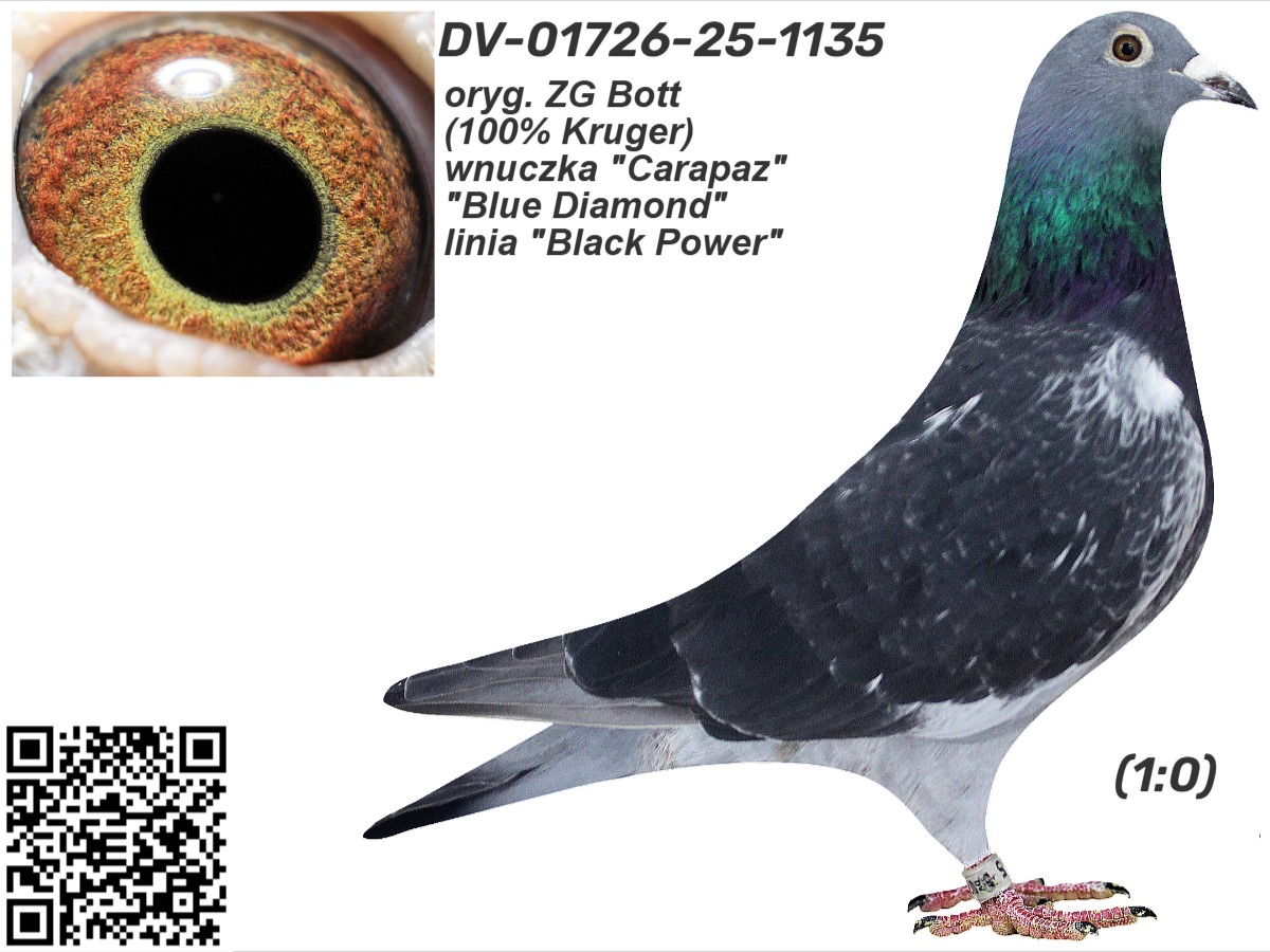 oryg. ZG Bott (100% Kruger), wnuczka "Carapaz", "Blue Diamond", linia "Black Power" Szczegóły pochodzenia w rodowodzie. Gołąb jest sprzedawany bezpośrednio od hodowcy i znajduje się w Polsce, można go obejrzeć w miejscowości Zblewo (woj. pomorskie), po wcześniejszym kontakcie telefonicznym. Więcej informacji o gołębiu i transporcie pod nr tel.: 511 607 710.
