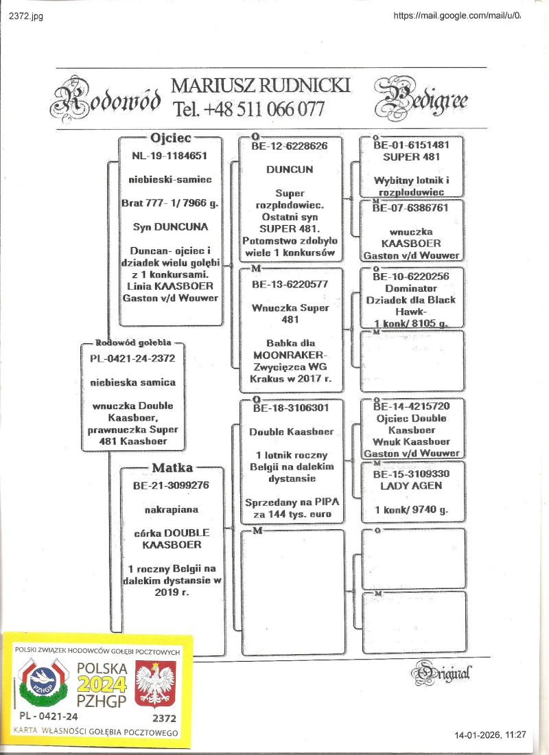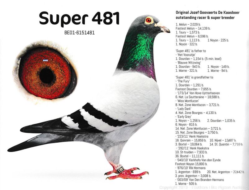 Ojciec to wnuk SUPER 481, pełny brat KAASBOERINNEKE 777 i syn DUNCUNA. Matka córka DOUBLE KAASBOER- najlepszego roczniaka Belgii w lotach dalekich. DOUBLE KAASBOER sprzedany na PIPA za 144 tys. euro. Szczegóły pochodzenia w rodowodzie i pod nr tel. 696 241 555