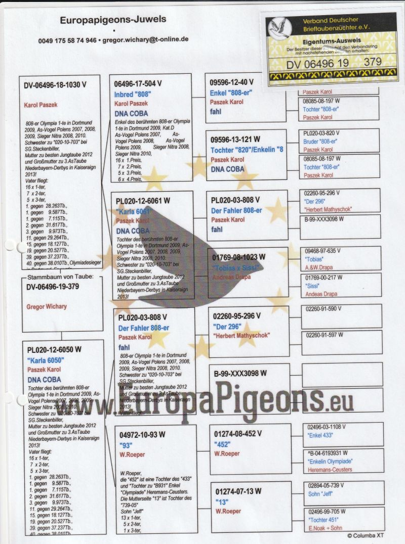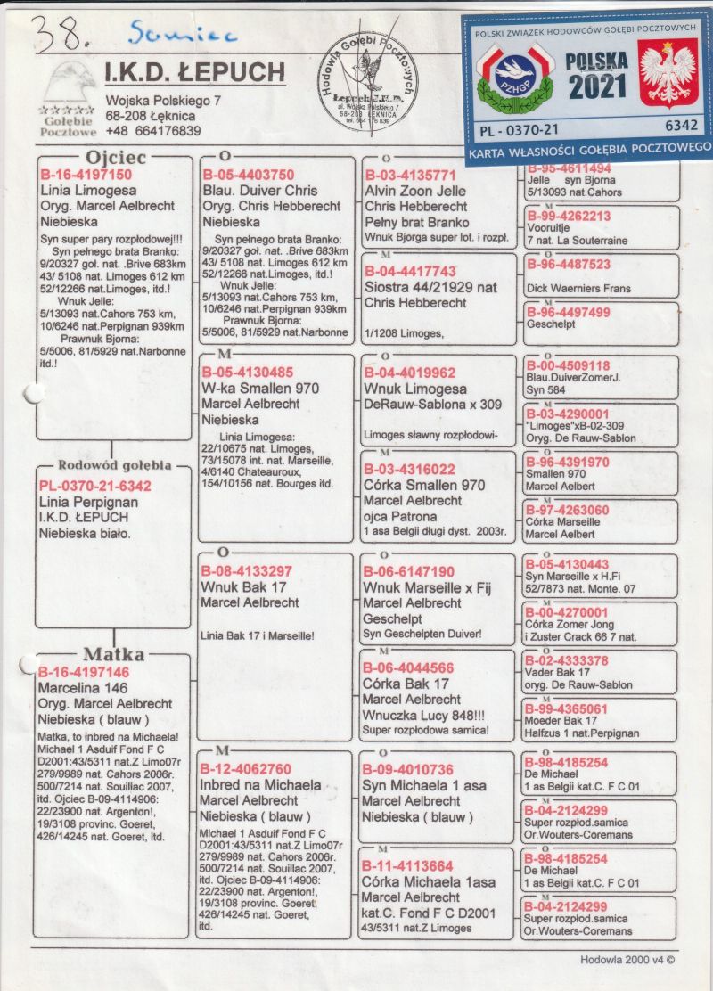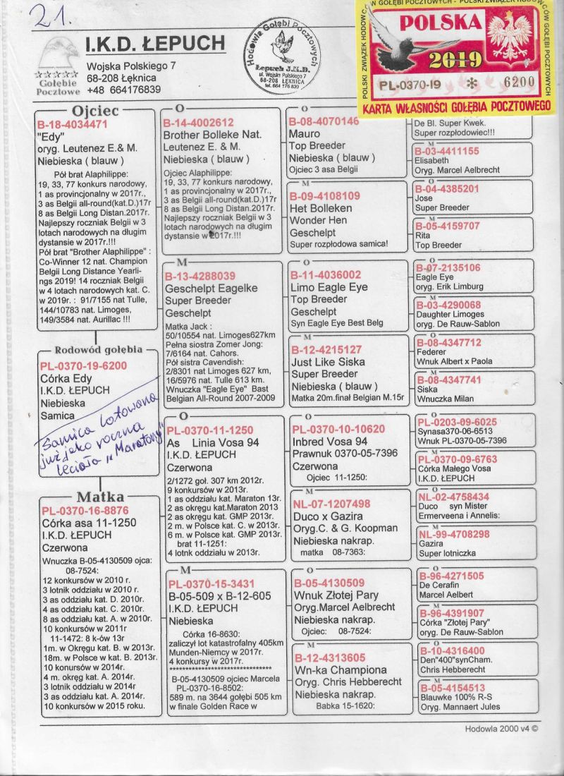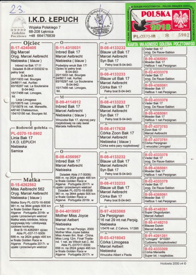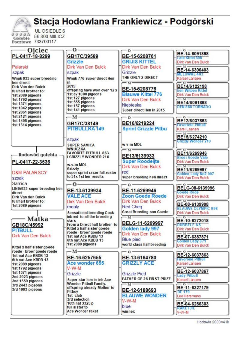 STACJA HODOWLANA FRANKIEWICZ PODGÓRSKI WYSTAWIA NA LICYTACJE PAKIET 10 MŁODYCH + 2 GRATIS Z DRUGIEGO LĘGU Z GOŁĘBNIKA ROZPŁODOWEGO ODBIÓR GOŁEBI W DRUGIEJ POŁOWIE MAJA . HODOWCA SAM WYBIERA MŁODE . POD SPODEM PRZYKŁADOWE RODOWODY RODZICÓW DLA ZAINTERESOWANYCH MOGĘ PODESŁAC NA PRIV JAK SA SPAROWANE GOŁEBIE.