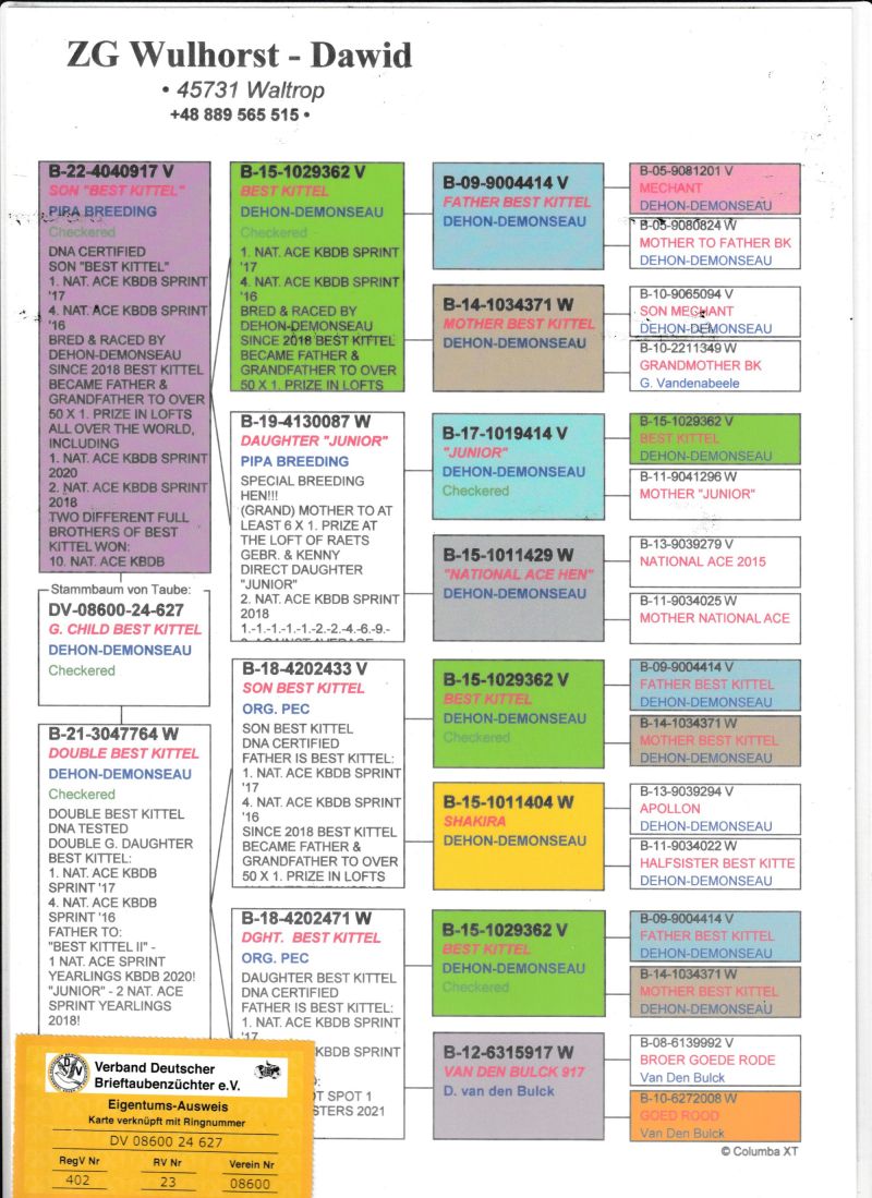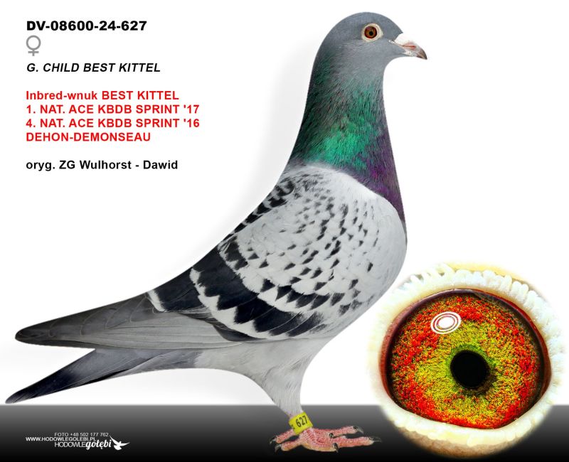 Samica zakupiona w lutym 2025 ze spółki SG Wulhorst-Dawid. Na przełomie maja i czerwca połączona na jedną parę młodych. Ptak przygotowany do łączenia w pary na nowy sezon.