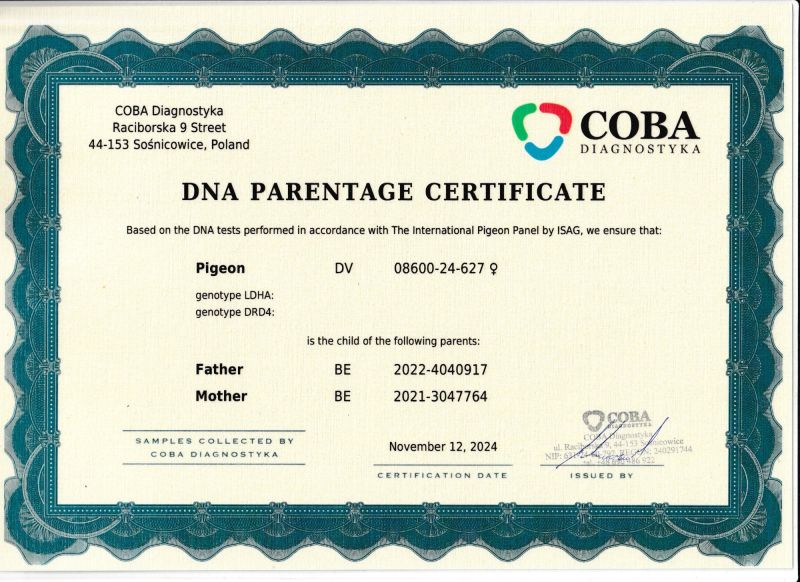 Szczegóły pochodzenia znajdą Państwo w rodowodzie. Samica posiada certyfikat DNA.