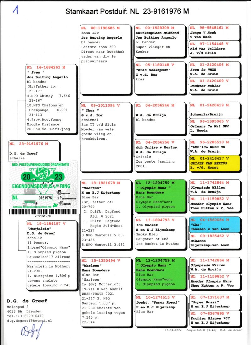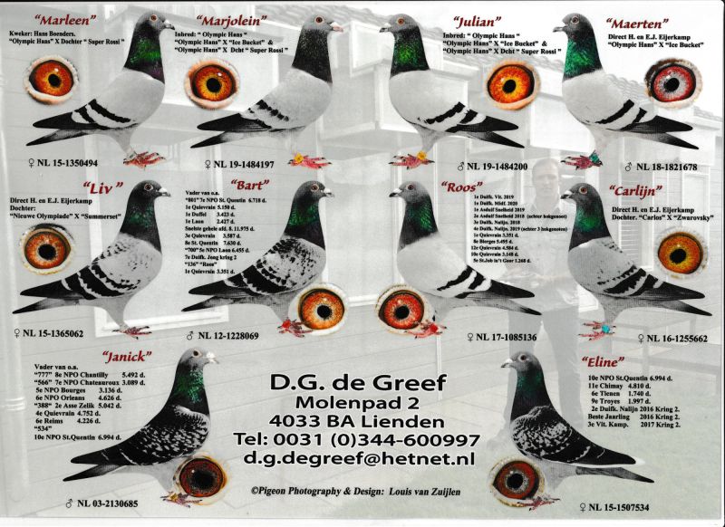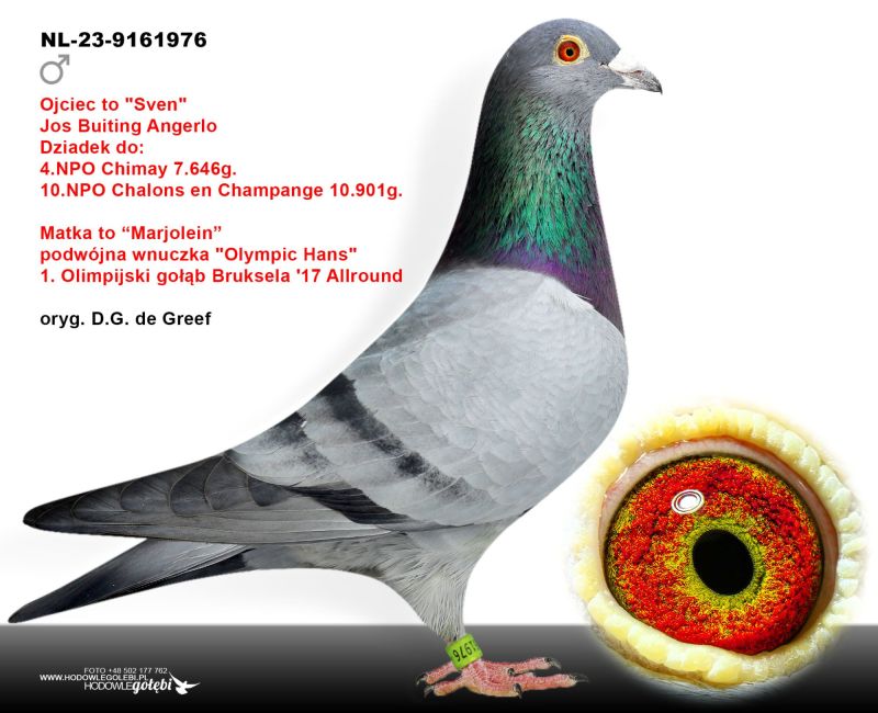 Samiec z hodowli D.G. de Greef o pięknej budowie i barwie schali. Jego ojcem jest "SVEN" - bardzo dobry gołąb w rozpłodzie, który wydał takie gołębie jak: 4. NPO, 10. NPO, 4 PROV..