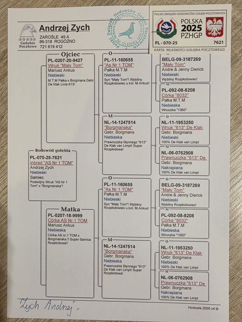 Oryginalny gołąb z hodowli Andrzeja Zycha. Szczegóły pochodzenia zamieszczone w rodowodzie. Więcej informacji pod numerem telefonu: 721 619 412