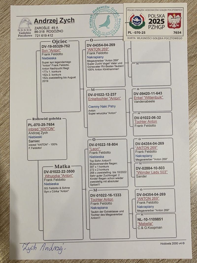 Oryginalny gołąb z hodowli Andrzeja Zycha. Szczegóły pochodzenia zamieszczone w rodowodzie. Więcej informacji pod numerem telefonu: 721 619 412
