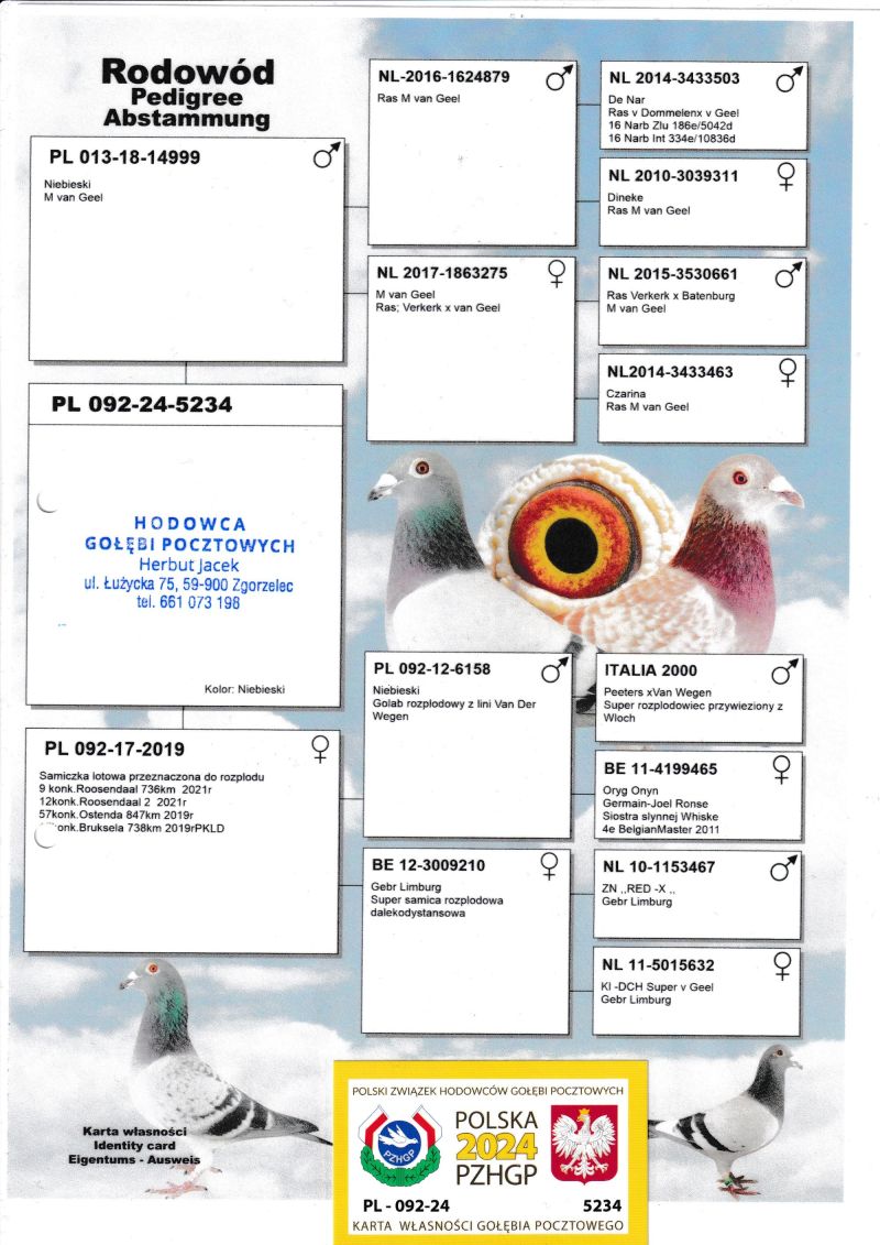 Posiadam w swojej hodowli gołębie Allround i na długie dystanse z linii 100% Martha Van Geel, Gebr. Limburg, Peeters Anton van der Wegen, Aarden, Van Wanroy, George Carteus, Onijn Germain & Joel Ronse. Szczegóły pochodzenia w rodowodzie oraz pod numerem telefonu: 661 073 198