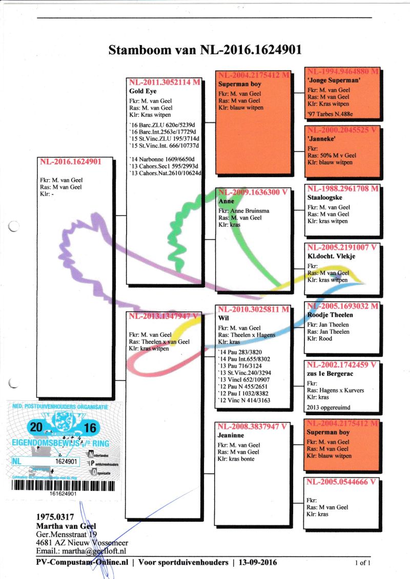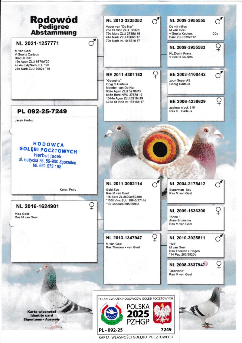Posiadam w swojej hodowli gołębie Allround i na długie dystanse z linii 100% Martha Van Geel, Gebr. Limburg, Peeters Anton van der Wegen, Aarden, Van Wanroy, George Carteus, Onijn Germain & Joel Ronse. Szczegóły pochodzenia w rodowodzie oraz pod numerem telefonu: 661 073 198