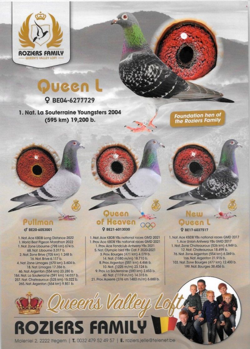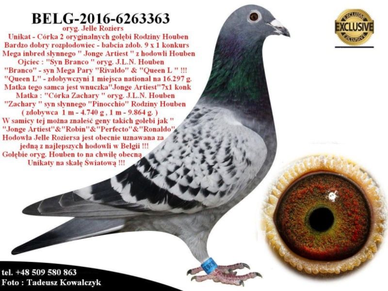 AUKCJA PROMOCYJNA (Cena obowiązuje wyłącznie na tej aukcji) Profesjonalna hodowla z wieloletnim doświadczeniem, posiadająca w swoim stadzie materiał najwyższej światowej klasy, wywodzący się od takich hodowców jak: Jan Hooymans, Gerard Koopman, Mike Ganus, Tjeerd & Jouke Elzinga, Gino Clicque, Jos Vercammen, Jelle Roziers, Bart Geerinckx, Batenburg – v/d Merwe, Altmiks – Pigeons, Jo & Florian Hendriks, Kornelis Winner Loft – linia „Romario”, W & F Ebben, Bert Braspenning, Dirk van den Bulck, Peter v/d Merwe, Jan van de Pasch, Van Elsacker-Jepsen, Roger Desmet – Matthijs, Arie Dijkstra, Leo Heremans, Pieter Veenstra, Gaby Vandenabeele, Karl-Heinz Wichert, Hardy Kruger, Helmut & Alfons Klaas, Gebr. Janssen. Najwyższej klasy materiał hodowlany – najlepsze linie danych Hodowców. Wszystkie wylicytowane gołębie będą dostarczane firmą kurierską.