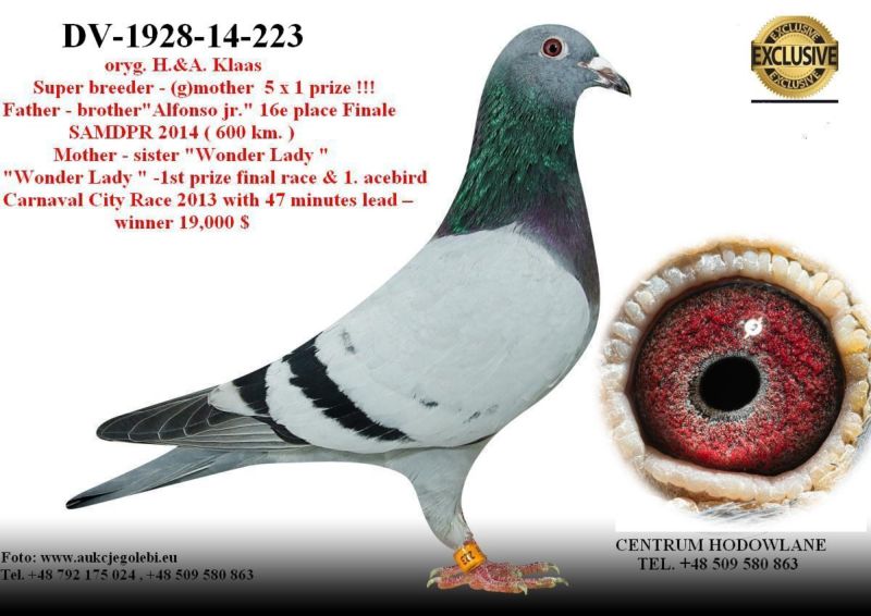 AUKCJA PROMOCYJNA (Cena obowiązuje wyłącznie na tej aukcji) Profesjonalna hodowla z wieloletnim doświadczeniem, posiadająca w swoim stadzie materiał najwyższej światowej klasy, wywodzący się od takich hodowców jak: Jan Hooymans, Gerard Koopman, Mike Ganus, Tjeerd & Jouke Elzinga, Gino Clicque, Jos Vercammen, Jelle Roziers, Bart Geerinckx, Batenburg – v/d Merwe, Altmiks – Pigeons, Jo & Florian Hendriks, Kornelis Winner Loft – linia „Romario”, W & F Ebben, Bert Braspenning, Dirk van den Bulck, Peter v/d Merwe, Jan van de Pasch, Van Elsacker-Jepsen, Roger Desmet – Matthijs, Arie Dijkstra, Leo Heremans, Pieter Veenstra, Gaby Vandenabeele, Karl-Heinz Wichert, Hardy Kruger, Helmut & Alfons Klaas, Gebr. Janssen. Najwyższej klasy materiał hodowlany – najlepsze linie danych Hodowców. Wszystkie wylicytowane gołębie będą dostarczane firmą kurierską.