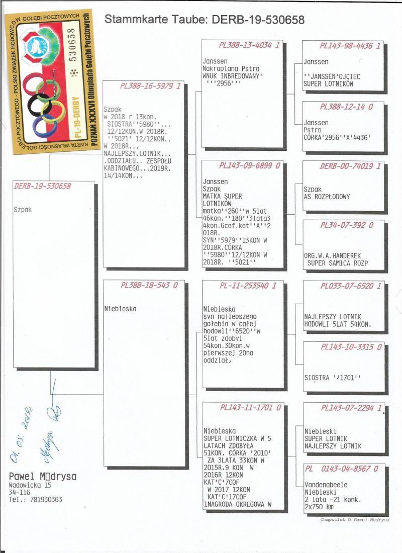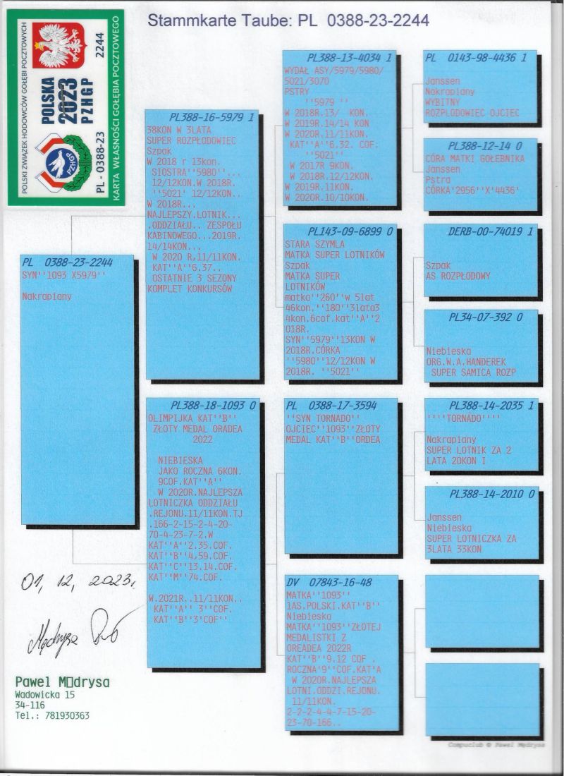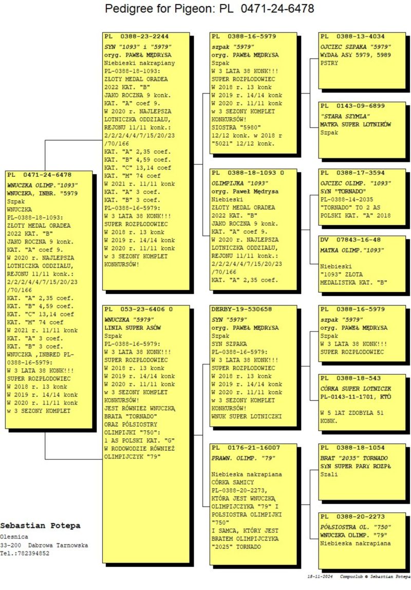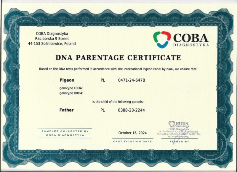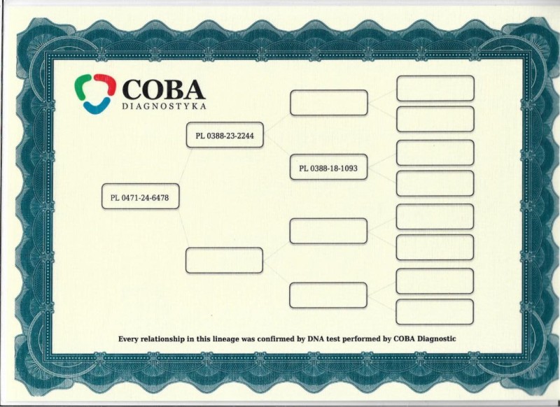 PL-0471-24-6478 - oryg. S. Potępa (100% P. Mędrysa) wnuczka OLIMPIJKI 1093, wnuczka inbredka szpaka 5979 CERTYFIKAT DNA