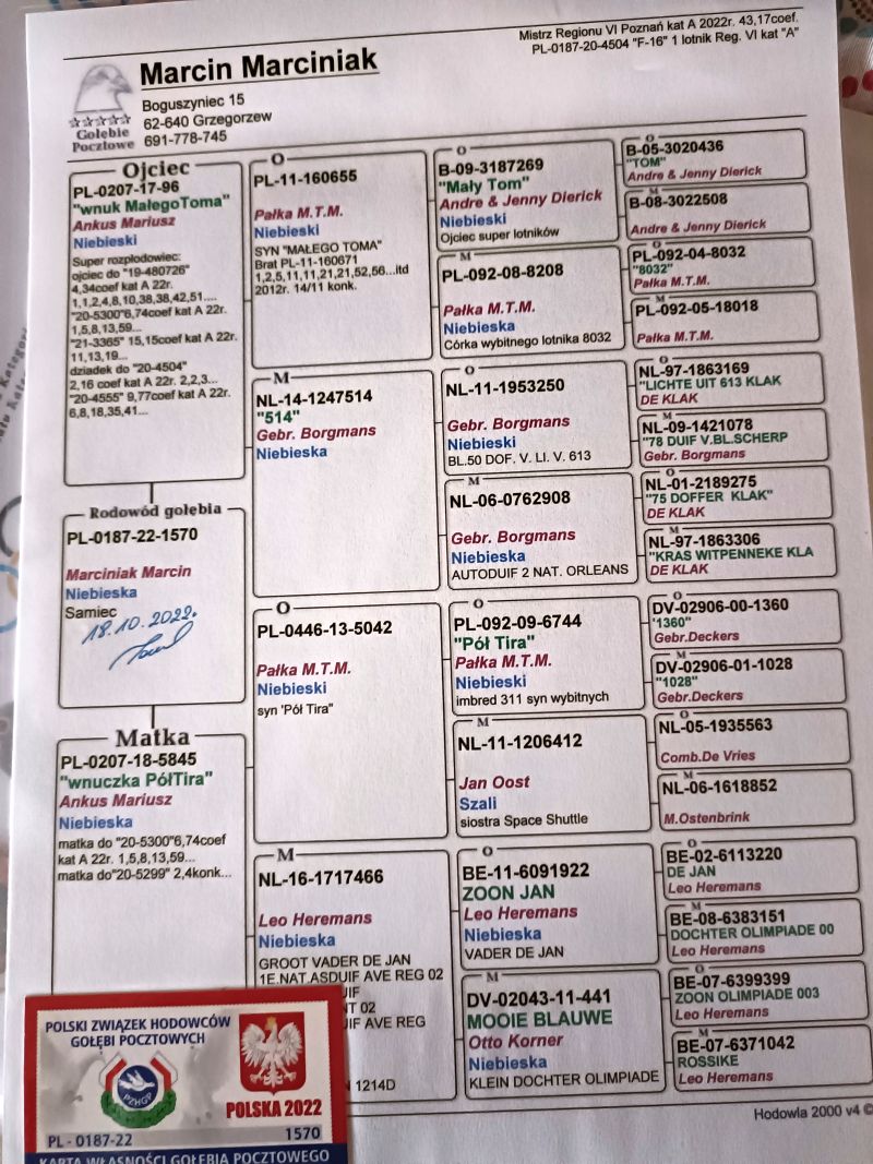 Oryginalny gołab z hodowli Marcina Marciniaka. Szczegóły pochodzenia w rodowodzie. Więcej informacji pod nr tel.: 730045046 prosze dzwonic po godz. 15 **przed zalicytowaniem proszę o kontakt z właścicielem w sprawie płci oferowanego gołębia