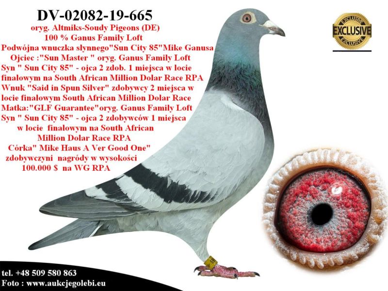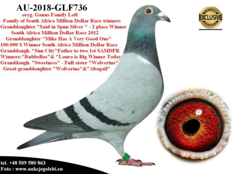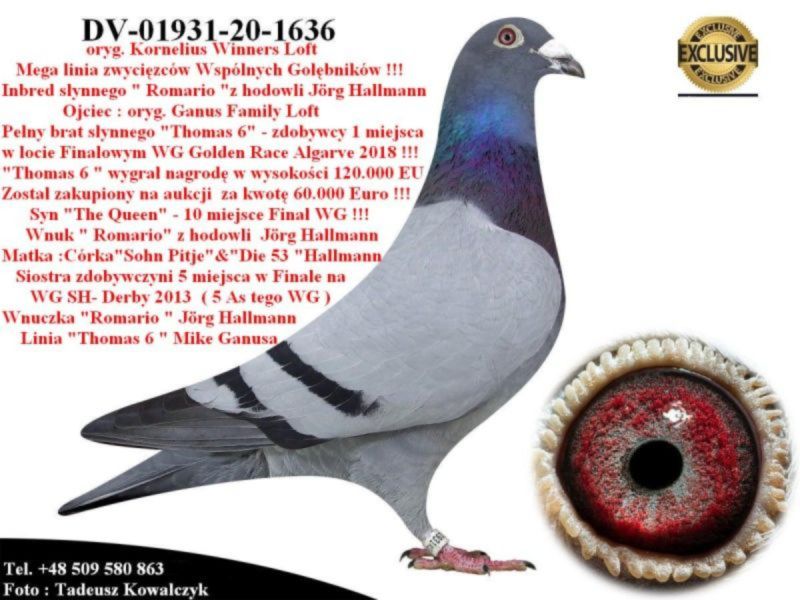 AUKCJA PROMOCYJNA (Cena obowiązuje wyłącznie na tej aukcji) Profesjonalna hodowla z wieloletnim doświadczeniem, posiadająca w swoim stadzie materiał najwyższej światowej klasy, wywodzący się od takich hodowców jak: Jan Hooymans, Gerard Koopman, Mike Ganus, Tjeerd & Jouke Elzinga, Gino Clicque, Jos Vercammen, Jelle Roziers, Bart Geerinckx, Batenburg – v/d Merwe, Altmiks – Pigeons, Jo & Florian Hendriks, Kornelis Winner Loft – linia „Romario”, W & F Ebben, Bert Braspenning, Dirk van den Bulck, Peter v/d Merwe, Jan van de Pasch, Van Elsacker-Jepsen, Roger Desmet – Matthijs, Arie Dijkstra, Leo Heremans, Pieter Veenstra, Gaby Vandenabeele, Karl-Heinz Wichert, Hardy Kruger, Helmut & Alfons Klaas, Gebr. Janssen. Najwyższej klasy materiał hodowlany – najlepsze linie danych Hodowców. Wszystkie wylicytowane gołębie będą dostarczane firmą kurierską.