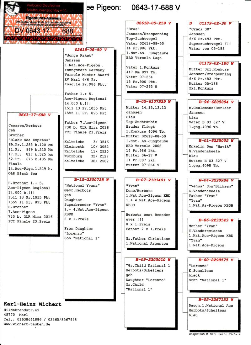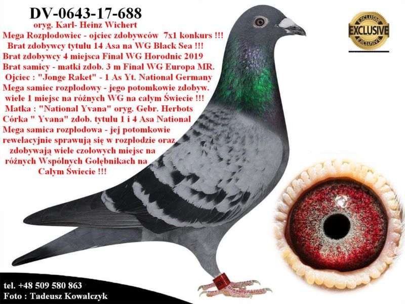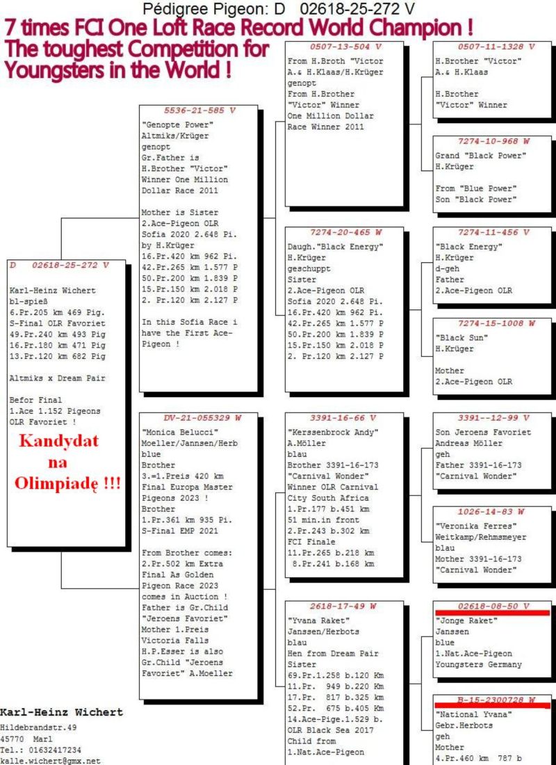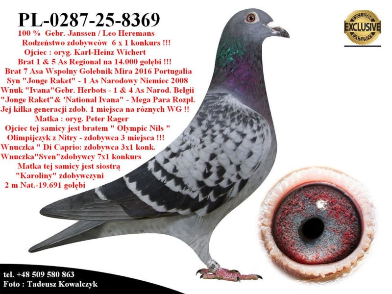 AUKCJA PROMOCYJNA (Cena obowiązuje wyłącznie na tej aukcji) Profesjonalna hodowla z wieloletnim doświadczeniem, posiadająca w swoim stadzie materiał najwyższej światowej klasy, wywodzący się od takich hodowców jak: Jan Hooymans, Gerard Koopman, Mike Ganus, Tjeerd & Jouke Elzinga, Gino Clicque, Jos Vercammen, Jelle Roziers, Bart Geerinckx, Batenburg – v/d Merwe, Altmiks – Pigeons, Jo & Florian Hendriks, Kornelis Winner Loft – linia „Romario”, W & F Ebben, Bert Braspenning, Dirk van den Bulck, Peter v/d Merwe, Jan van de Pasch, Van Elsacker-Jepsen, Roger Desmet – Matthijs, Arie Dijkstra, Leo Heremans, Pieter Veenstra, Gaby Vandenabeele, Karl-Heinz Wichert, Hardy Kruger, Helmut & Alfons Klaas, Gebr. Janssen. Najwyższej klasy materiał hodowlany – najlepsze linie danych Hodowców. Wszystkie wylicytowane gołębie będą dostarczane firmą kurierską.