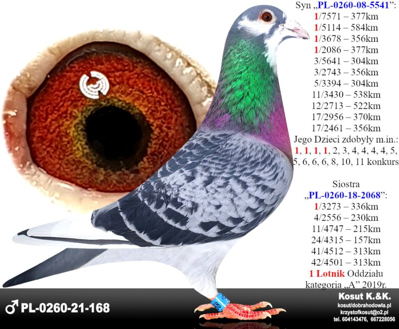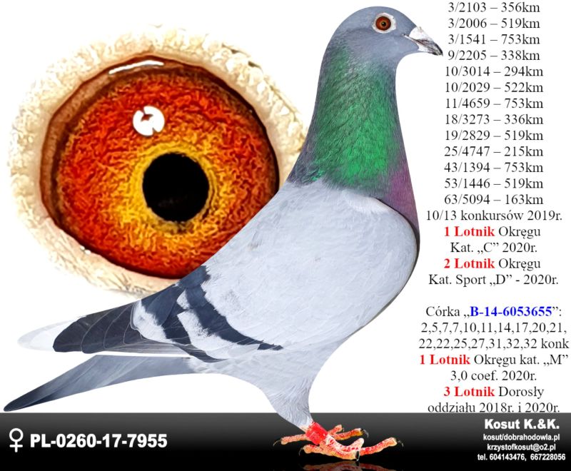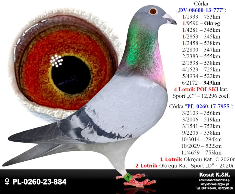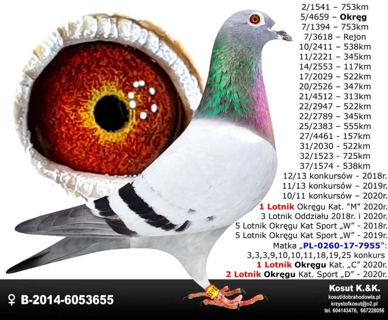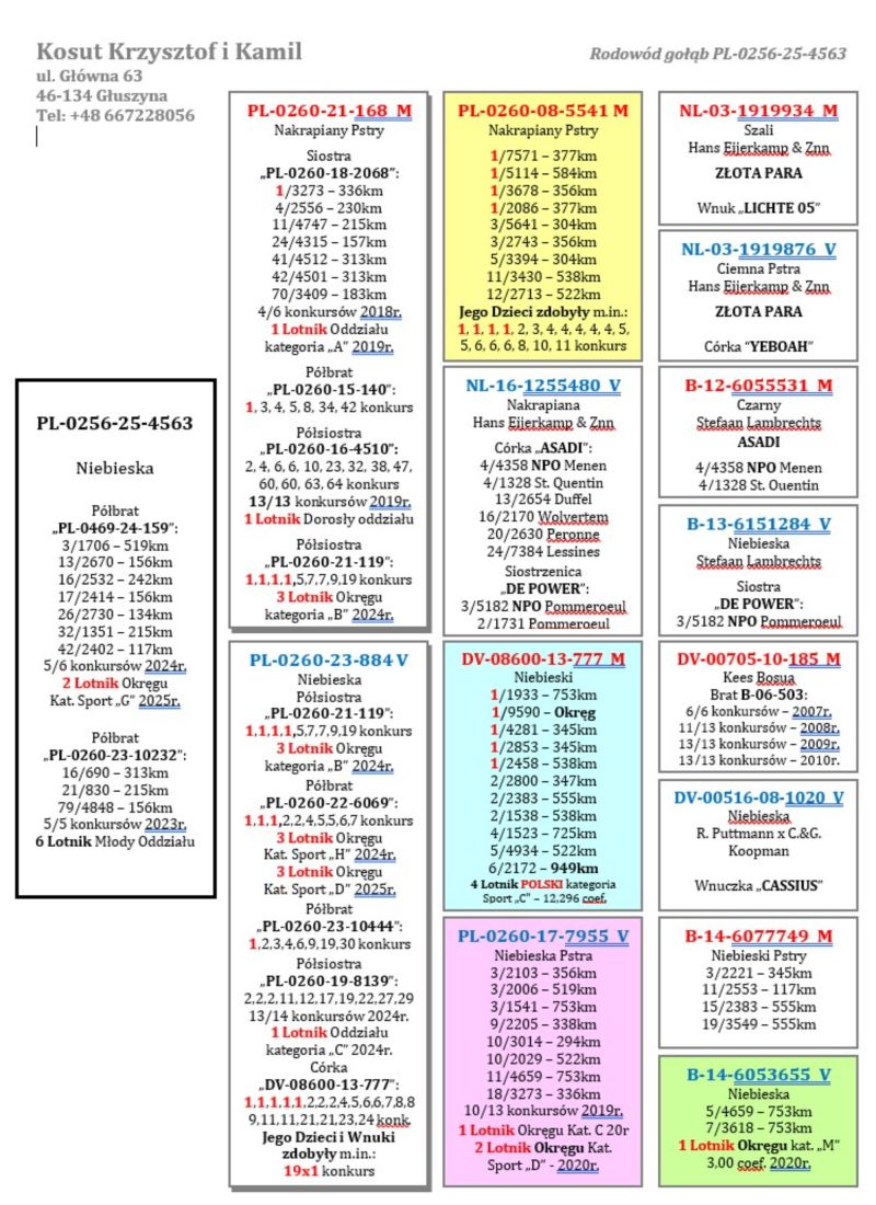 Oryginalny gołąb z hodowli Krzysztof i Kamil Kosut. Szczegóły pochodzenia w rodowodzie. Więcej informacji na stronie www.facebook.com/kosut.dobrahodowla oraz pod nr tel.: 667 228 056. Są To OSTATNIE Gołębie z rocznika 2025 na sprzedaż!! Dostawa gołębi będzie realizowana po zakończeniu aukcji kurierem 165zł lub odbiór osobisty. Możliwy jest także odbiór osobisty.