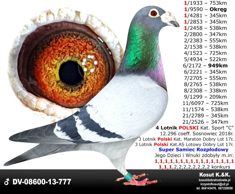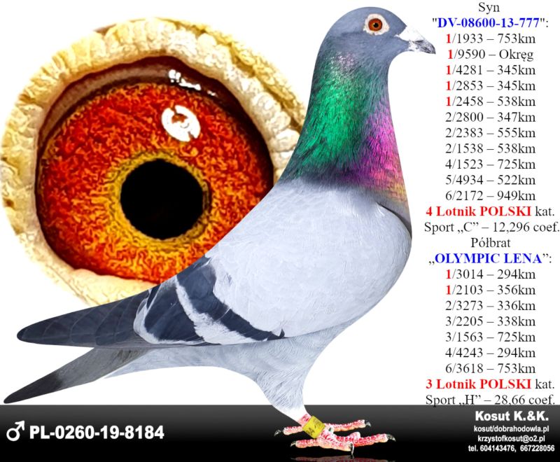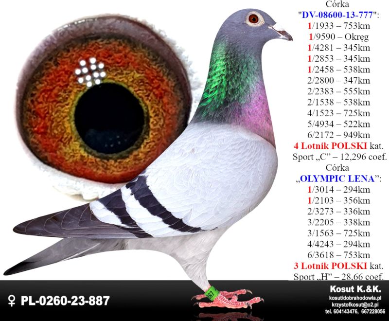 Oryginalny gołąb z hodowli Krzysztof i Kamil Kosut. Szczegóły pochodzenia w rodowodzie. Więcej informacji na stronie facebook.com/kosut.dobrahodowla oraz pod nr tel.: 667 228 056. Są To OSTATNIE Gołębie z rocznika 2025 na sprzedaż!! Dostawa gołębi będzie realizowana po zakończeniu aukcji kurierem 165zł lub odbiór osobisty. Możliwy jest także odbiór osobisty.
