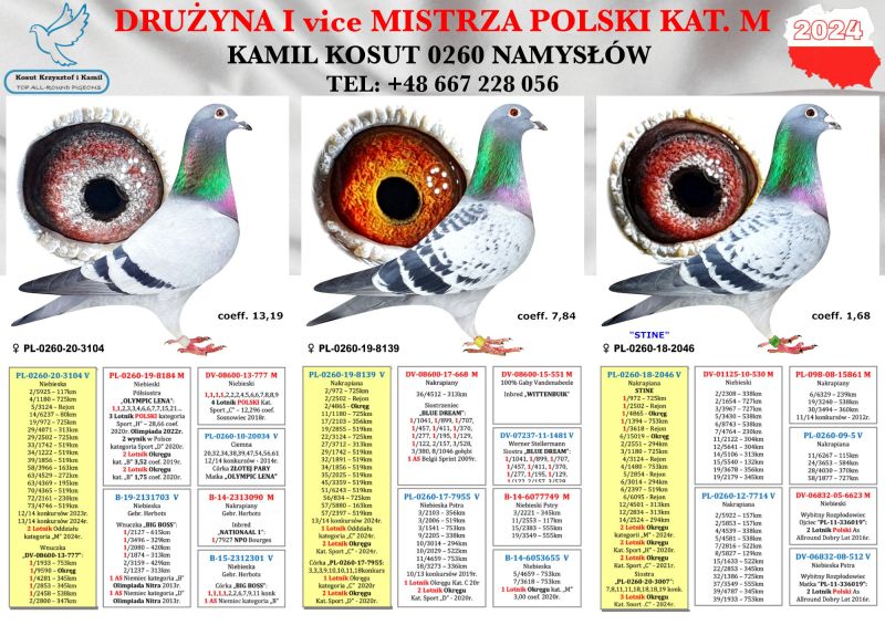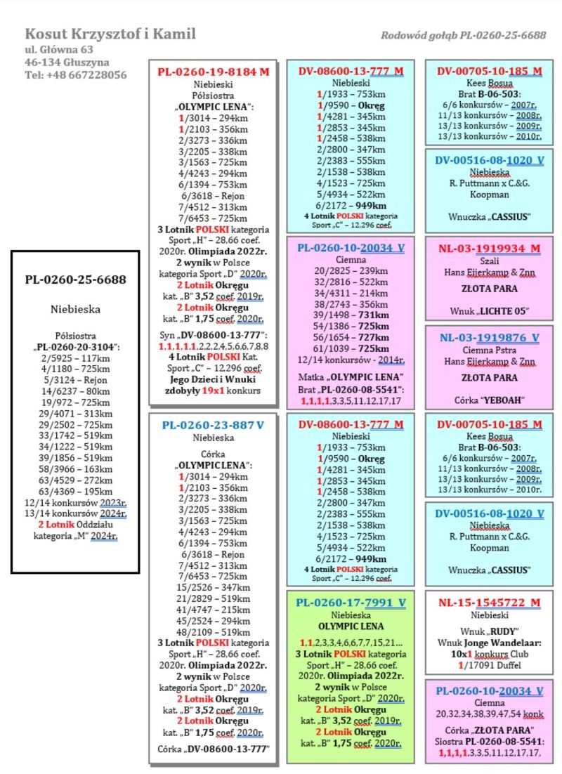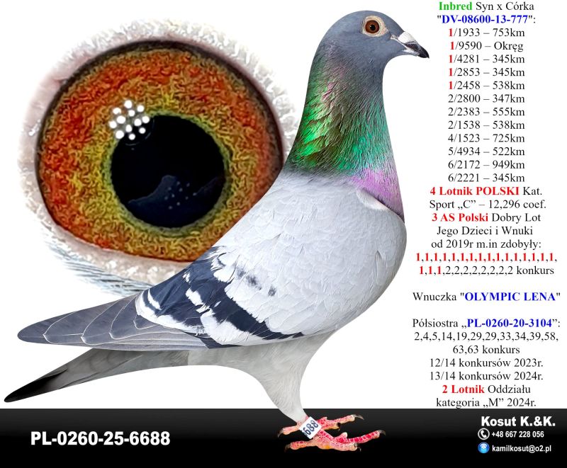 PL-0260-25-6688 – Inbred Syn x Córka „777” – 1,1,1,1,1 konkurs 4 Lotnik Polski oryg. Kosut K. & K. 85x1 konkurs Oddział