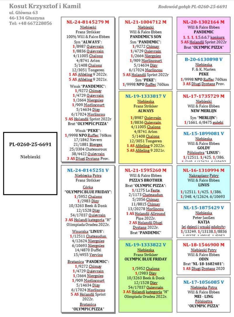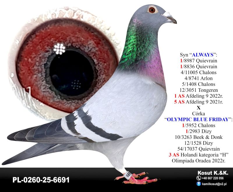Oryginalny gołąb z hodowli Krzysztof i Kamil Kosut. Szczegóły pochodzenia w rodowodzie. Więcej informacji na stronie facebook.com/kosut.dobrahodowla oraz pod nr tel.: 667 228 056. Są To OSTATNIE Gołębie z rocznika 2025 na sprzedaż!! Dostawa gołębi będzie realizowana po zakończeniu aukcji kurierem 165zł lub odbiór osobisty. Możliwy jest także odbiór osobisty.