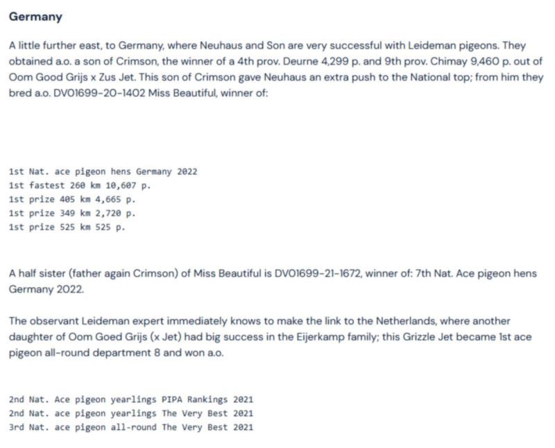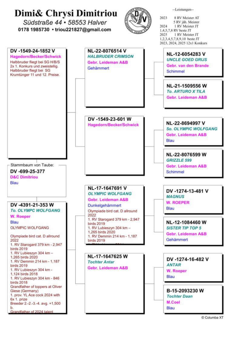 Oryginalny gołąb z hodowli Dimi & Chrysi Dimitriou. Szczegóły pochodzenia w rodowodzie. Ostatnie wyniki tego tandemu: Jungtauben vom Doppel-Jungtaubenmeister 2024 & 2025. Jungtaubenmeister 2024 und 2025 in der RV. 5x 1. Konkurs in zwei Jahren. 5. Jungtaubenmeister im RegV 405 (2025). Jungtaubenmeister der Sauerländischen RV 2024. 5 Tauben unter den Top 10 der RV. Plätze: 1, 4, 5, 7, 8. 3x 1. Konkurs geflogen. Jungtaubenmeister der RV 2025. 5. Jungtaubenmeister intern im Regionalverband 405. 9 Tauben unter den Top 10 der RV. Plätze: 1 bis 5, 7 bis 10, 13 & 20. 2x 1. Konkurs geflogen