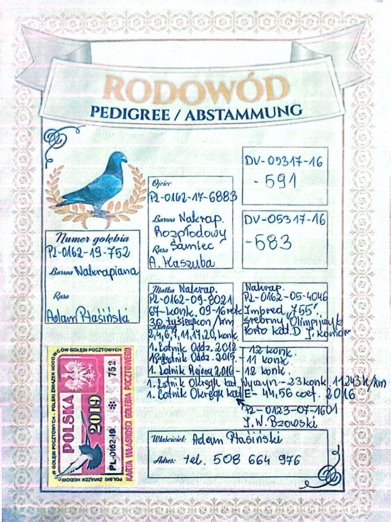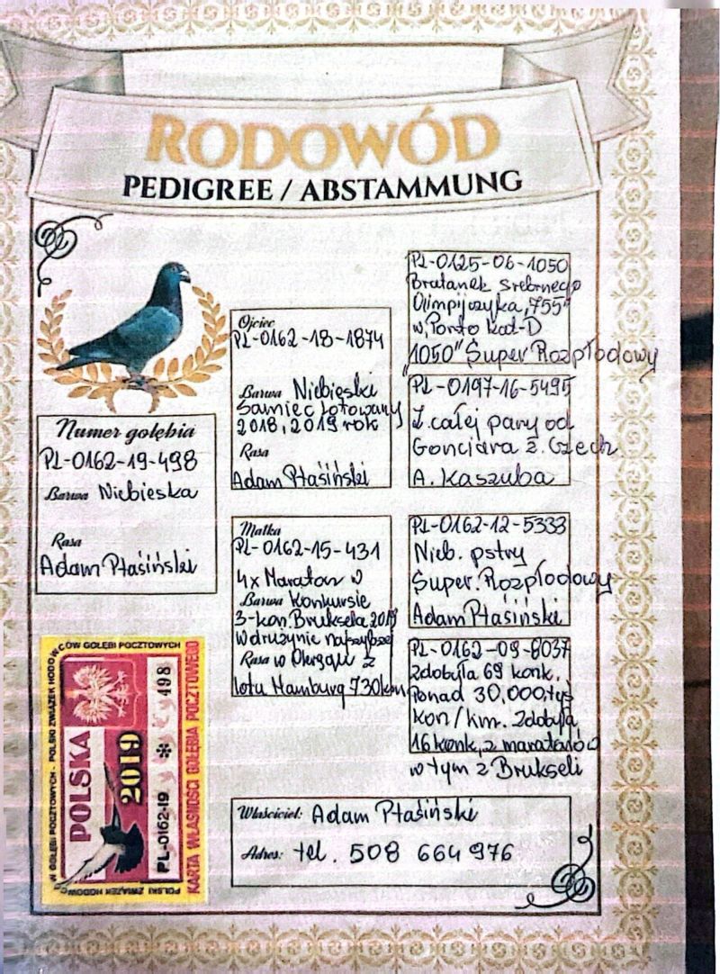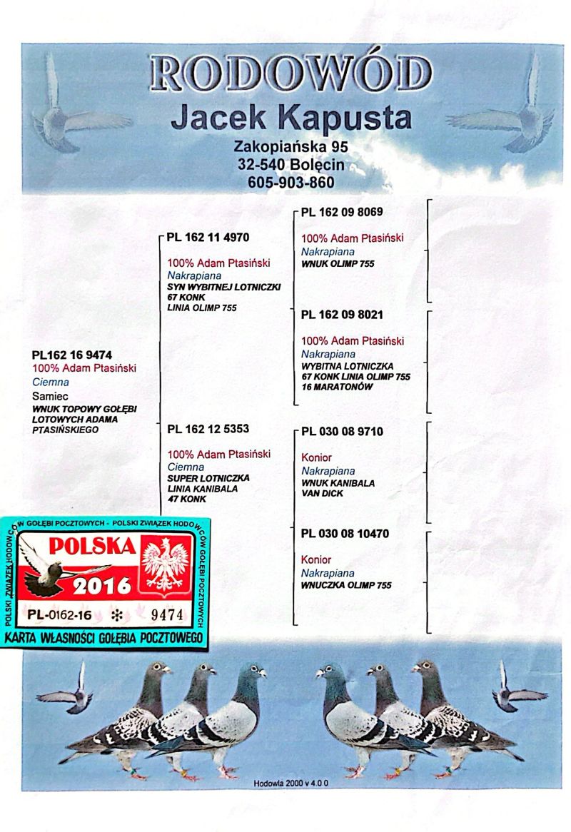 PL-0162-16-9474 Wnuk Topowych Gołębi Lotowych Adama PTASIŃSKIEGO