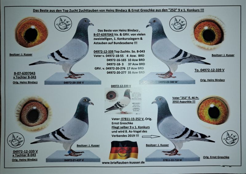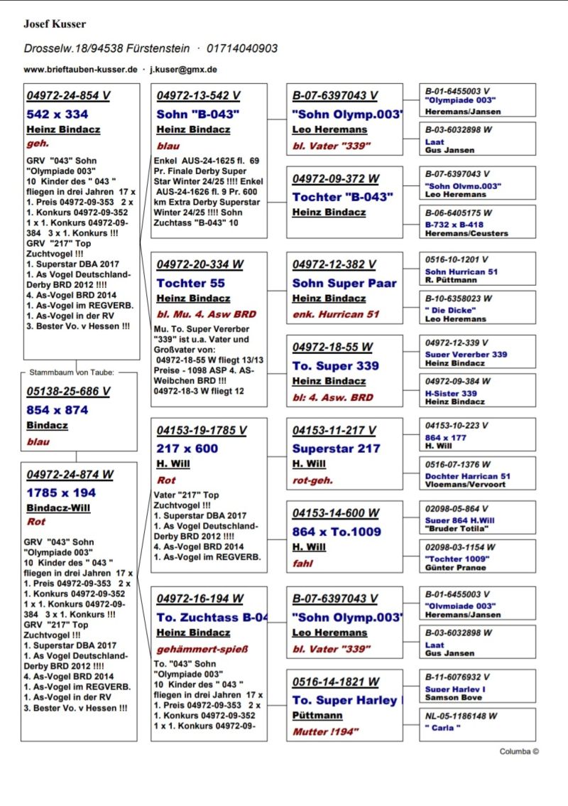 Oryginalny gołąb z hodowli kolegi Josef Kusser, najprawdopodobniej samczyk. Szczegóły pochodzenia w rodowodzie. Więcej informacji pod nr tel.: Josef Kusser +491714040903 Adrian +4869279346