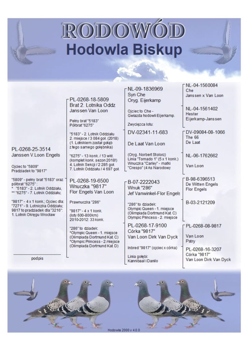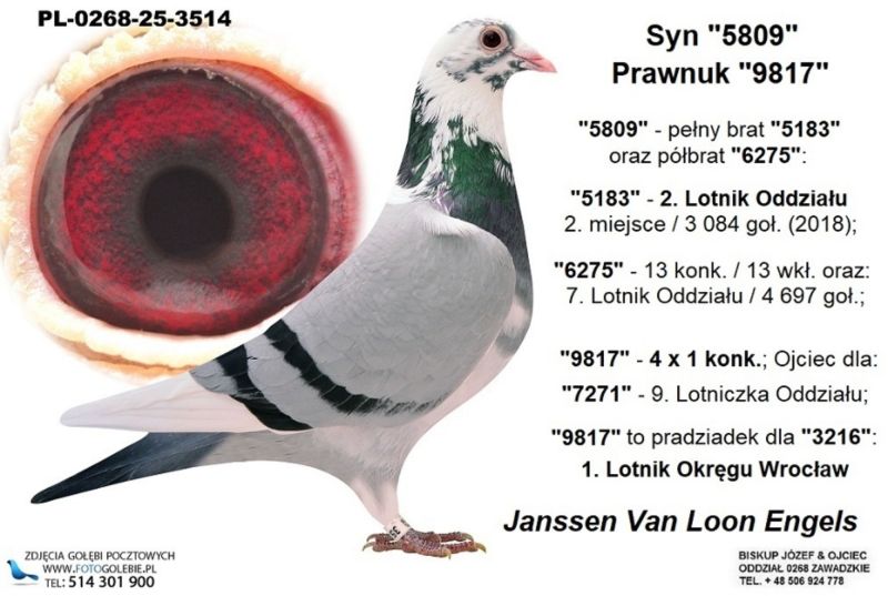 Ojciec to "5809"; Pradziadek to "9817"; "5809" - pełny brat "5183" oraz półbrat "6275" : * "5183" - 2. Lotnik Oddziału, ** "6275" - 7. Lotnik Oddziału; "9817" - 4 x 1 konk.; Ojciec dla: "7271" - 9. Lotniczka Oddziału; 9817 to pradziadek dla "3216": 1. Lotnik Okręgu Wrocław /// Koszt wysyłki 150 zł ///