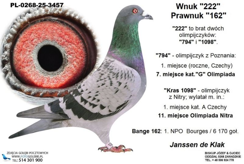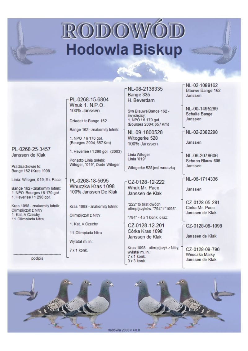 Pradziadkowie to: Bange 162 i Kras 1098; Linia: Witoger, 019, Mr. Paco; Bange 162 - znakomity lotnik: 1. NPO Bourges / 6 170 goł., 1. Heverlee / 1 290 goł.; Kras 1098 - znakomity lotnik: Olimpijczyk z Nitry, 1. Kat. A Czechy, 11. Olimpiada Nitra /// Koszt wysyłki 150 zł ///