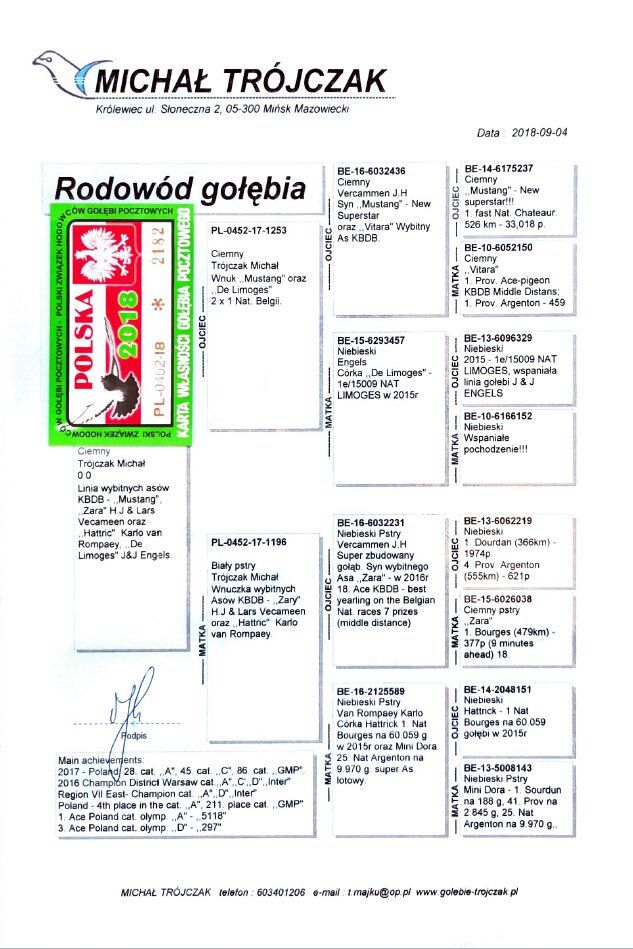 PL-0452-18-2182 oryg. Michał Trójczak z gołębi Vercammena „Mustang”, ”Vitara”, „Zara”