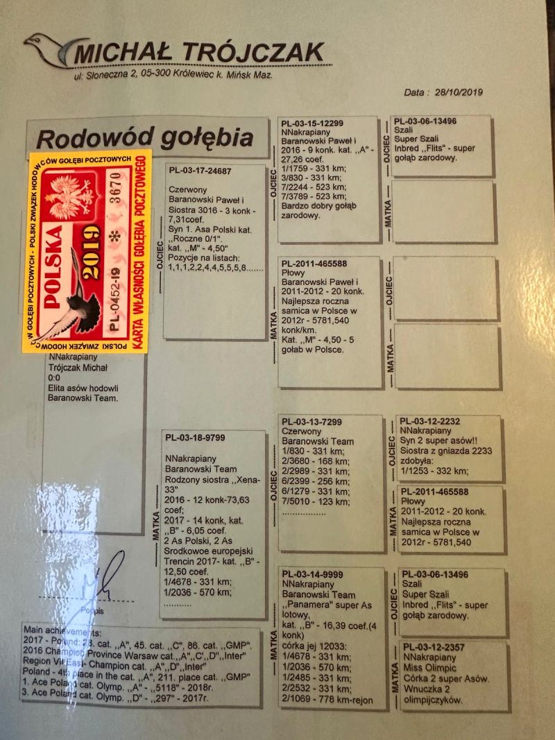 PL-0452-19-3670 oryg. Michał Trójczak z najlepszych gołębi braci Baranowskich