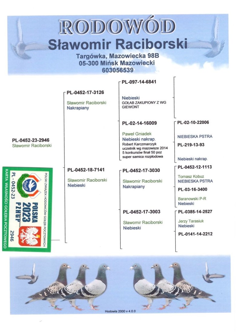 Samiczka zamówiona bezpośrednio u pana Sławka pod kategorię Allround, po wdowcach! Samiczka o super budowie. Matka 7141 wybitna lotniczka. Więcej informacji o pochodzeniu w rodowodzie. Zdjęcia wykonane bez filtrów, niestety gołębie przez okres zimy nie miały wstawianej kąpieli (mam zimne gołębniki i często docieram na gołębnik po południu) a na dodatek strasznie wariowały w koszu więc nie wyglądają jak z obrazka. Obecnie prezentują się świetnie – zrobiło się cieplej, dni są dłuższe więc mają raz w tygodniu kąpiel – zainteresowanym mogę wysłać zdjęcia lub film z konkretnym gołębiem. Gołębie zostały przygotowane do lęgów, bardzo szybko połączą się w pary (zostały rozłączone w listopadzie). Ze względu na odległość jaką mam do gołębnika (66km) i związane z tym utrudnienia w lotowaniu w oddziale od 2023r. zacząłem przygodę z WG (wysyłam zazwyczaj 3 lub 6 szt. na 2 max 3 WG). Moje gołębie zdobyły 6 , 16 i 97 Asa WG Roztocze '23, 24 miejsce z finału WG Warmia 23 i 11, 23,25, 31, 34, 37,49 ... miejsce z lotów konkursowych w 23r. W 2024 miałem 5 gołębia z półfinału WG Giewont i 47 Asa WG Roztocze. W 2025r. Najlepiej poradził sobie samczyk 15129 meldując się na 11 pozycji z bardzo ciężkiego finału WG Krakus, a 15121 zameldował się 82 z półfinału i 127 z extra finału WG Krakus 25. Na przestrzeni ostatnich lat zakupiłem do hodowli ponad 50 gołębi głównie z Wg Krakus, Giewont, Podhale, OLR Mira (prawie 10szt.), Algarve GD itd. Przy zakupie szczególną uwagę zwracałem na pochodzenie, wyniki lotowe w kilku pokoleniach dlatego pojawiły się oryginały od Pedro Porto, J. Koehoorn, Wings 2 Win, P. & K. Raponski, M. Sollner, Kłusiński&Chmielewski, Lach, Maziarz, Ośko, Chłopecki a także do testów przelotowane gołębie po gołębiach Tom van Gaver. Zachęcam do odbioru osobistego (mazowieckie) lub wyśle na koszt kupującego kurierem, koszt wg stawek (ok. 160zł). **Ważne: wysyłka nastąpi po wpłacie pieniędzy na konto. Gołębie należy odebrać zaraz po aukcji. Tel. kontaktowy 606-493-773