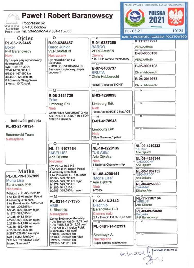 Oryginał od braci Baranowskich. Gołąb o świetnej budowie, średniej wielkości, odkupiony po pełnym programie WG Warmia 2021. Ojciec wydał 6 Asa młodego Okręgu. Pochodzi z gołębi Vercammena (Barco x Bruta) i Limburga( Blue Ace x Blue Dreaming). Matka „Mona Lisa” to inbred „Abelus” Arie Dijkstra, który jest ojcem „Błachnio” 2 Asa Tręcin kat.G, 1 As Polski kat.G. Zdjęcia wykonane bez filtrów, niestety gołębie przez okres zimy nie miały wstawianej kąpieli (mam zimne gołębniki i często docieram na gołębnik po południu) a na dodatek strasznie wariowały w koszu więc nie wyglądają jak z obrazka. Obecnie prezentują się świetnie – zrobiło się cieplej, dni są dłuższe więc mają raz w tygodniu kąpiel – zainteresowanym mogę wysłać zdjęcia lub film z konkretnym gołębiem. Gołębie zostały przygotowane do lęgów, bardzo szybko połączą się w pary (zostały rozłączone w listopadzie). Ze względu na odległość jaką mam do gołębnika (66km) i związane z tym utrudnienia w lotowaniu w oddziale od 2023r. zacząłem przygodę z WG (wysyłam zazwyczaj 3 lub 6 szt. na 2 max 3 WG). Moje gołębie zdobyły 6 , 16 i 97 Asa WG Roztocze '23, 24 miejsce z finału WG Warmia 23 i 11, 23,25, 31, 34, 37,49 ... miejsce z lotów konkursowych w 23r. W 2024 miałem 5 gołębia z półfinału WG Giewont i 47 Asa WG Roztocze. W 2025r. Najlepiej poradził sobie samczyk 15129 meldując się na 11 pozycji z bardzo ciężkiego finału WG Krakus, a 15121 zameldował się 82 z półfinału i 127 z extra finału WG Krakus 25. Na przestrzeni ostatnich lat zakupiłem do hodowli ponad 50 gołębi głównie z Wg Krakus, Giewont, Podhale, OLR Mira (prawie 10szt.), Algarve GD itd. Przy zakupie szczególną uwagę zwracałem na pochodzenie, wyniki lotowe w kilku pokoleniach dlatego pojawiły się oryginały od Pedro Porto, J. Koehoorn, Wings 2 Win, P. & K. Raponski, M. Sollner, Kłusiński&Chmielewski, Lach, Maziarz, Ośko, Chłopecki a także do testów przelotowane gołębie po gołębiach Tom van Gaver. Zachęcam do odbioru osobistego (mazowieckie) lub wyśle na koszt kupującego kurierem, koszt wg stawek (ok. 160zł). **Ważne: wysyłka nastąpi po wpłacie pieniędzy na konto. Gołębie należy odebrać zaraz po aukcji. Tel. kontaktowy 606-493-773