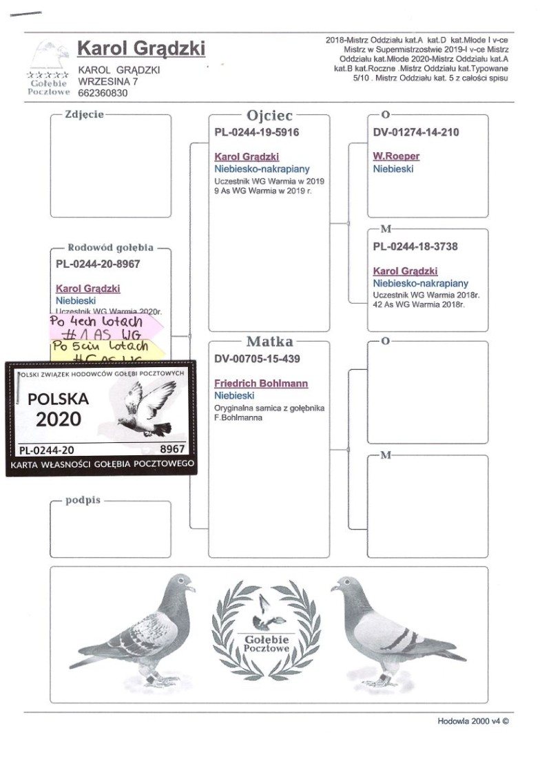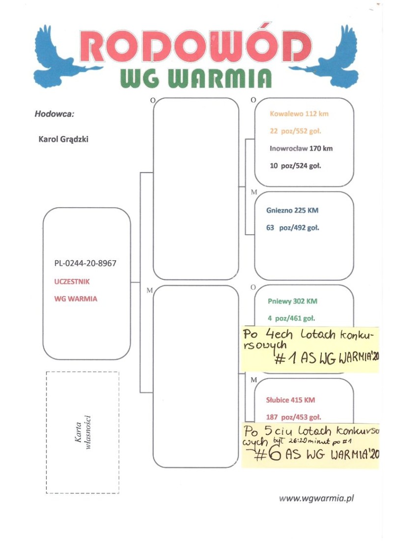 Samczyk z hodowli Karol Grądzki. Gołąb o większej , mocnej budowie. Odkupiony po całym programie WG Warmia 2020 gdzie z lotów konkursowych zdobył m.in. następujące miejsca 4 z 302km, 10 ze 170km, 22 ze 112km 63 z 225km do lotu finałowego był 1 Asem WG, niestety spóźnił powrót z finału i został 6 Asem WG!