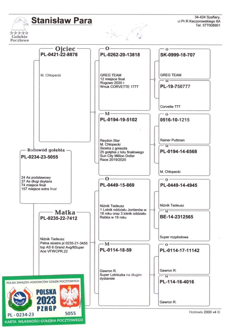 Polecam. Samiczka o super budowie, wyniku (24 AS WG Giewont'23 na prawie 3800przyjętych gołębi, 37AS dalekiego dystansu, 74 miejsce z finału i 157 miejsce z extra finału) i pochodzeniu (z góry Greg Team 12 z finału Rogowo'20, siostra 25 gołębia z finału Sun City Million Dollar Race 19/20, z dołu gołębie Tadeusza Niżnika pełna siostra top AS 6.Grand Avg / 8 Super Ace VFWCPR'22). Zdjęcia wykonane bez filtrów, niestety gołębie przez okres zimy nie miały wstawianej kąpieli (mam zimne gołębniki i często docieram na gołębnik po południu) a na dodatek strasznie wariowały w koszu więc nie wyglądają jak z obrazka. Obecnie prezentują się świetnie – zrobiło się cieplej, dni są dłuższe więc mają raz w tygodniu kąpiel – zainteresowanym mogę wysłać zdjęcia lub film z konkretnym gołębiem.