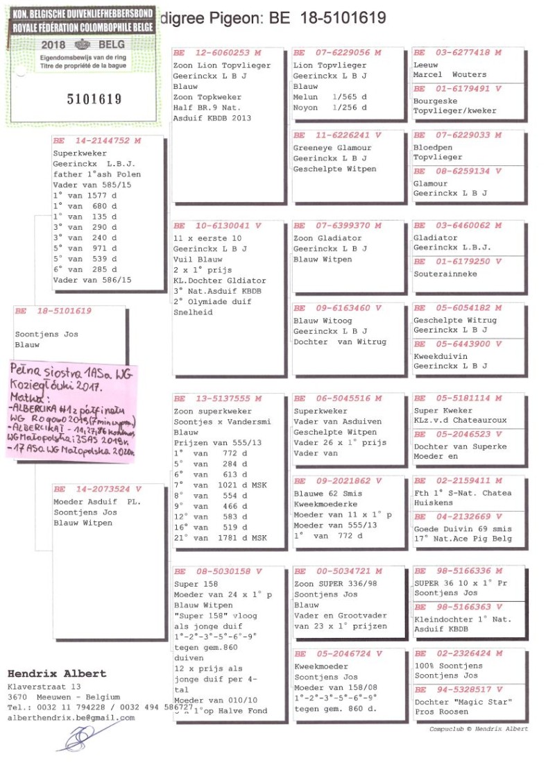 Oryginalna samica z hodowli Alberta Hendrixa, lekko większa, świetna budowa. W rodowodzie wybitne gołębie Geerinckxa (Gladiator, Lion Topvlieger, Glamour), Soontjes ( Super 36, Super 158, Blauwe 62 Smis, Superkweker). Jest to pełna siostra 1 Asa WG Koziegłówki 2017! Jest matką: -Albercika – 1 z półfinału 310km WG Rogowo 2019 7 minut wyprzedzenia