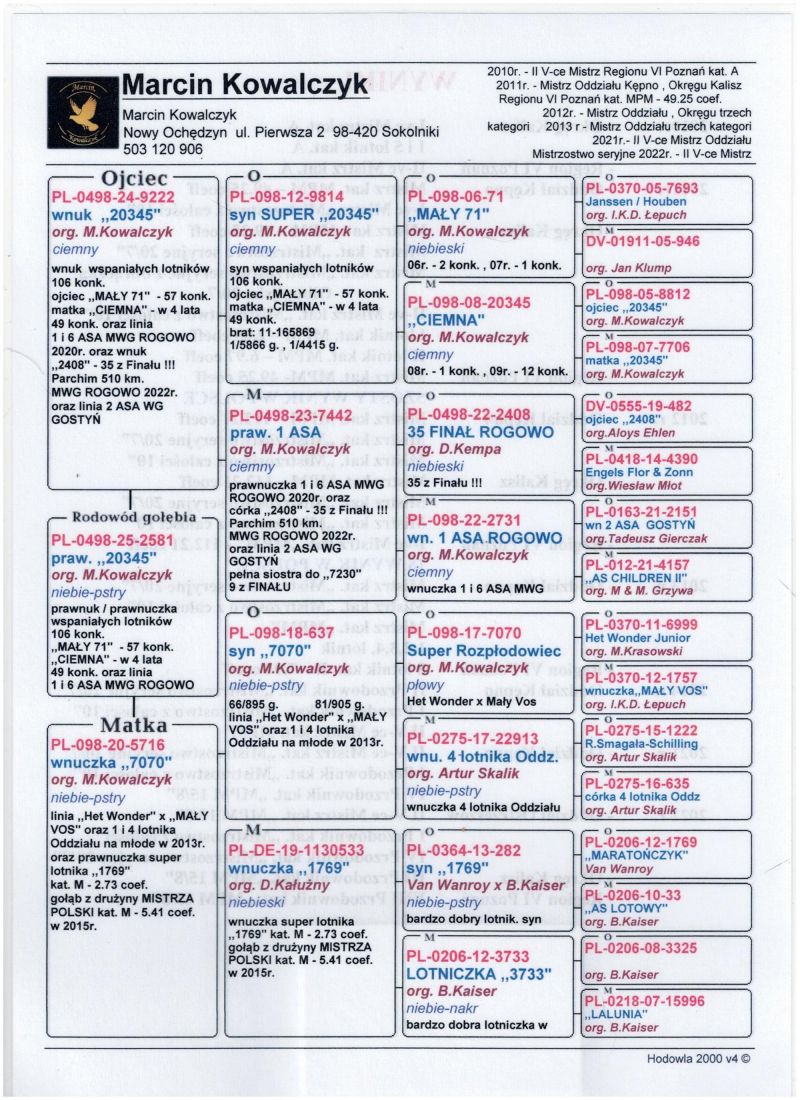 PL-0498-25-2581 - prawnuk "20345" w 4 lata 49 konk./linia "1769" kat. M - 2.73 coef. gołąb z drużyny MISTRZA POLSKI