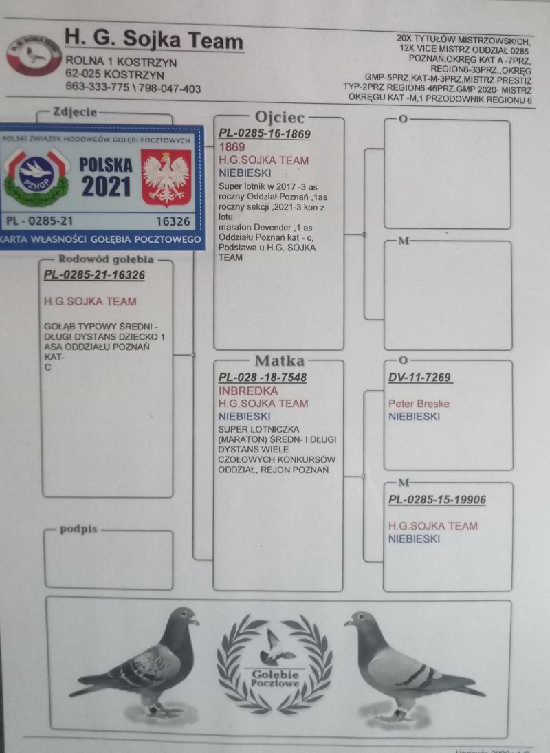 PL-0285-21-16326 oryg.H.G. Sojka Team córka 1 Asa oddziału kat. C