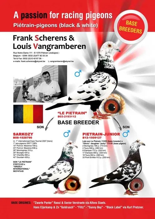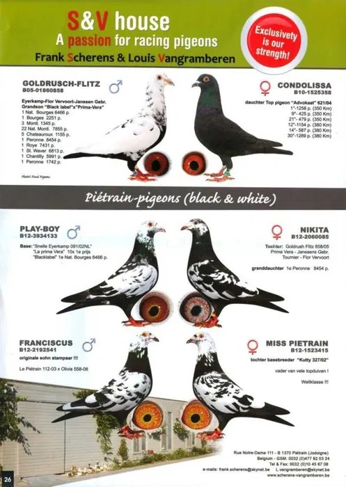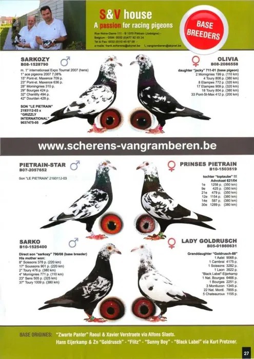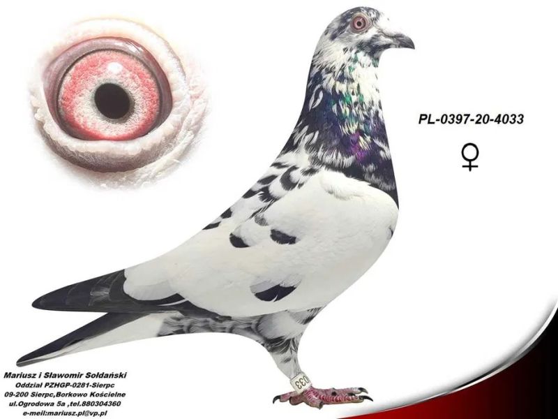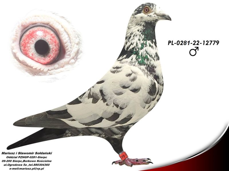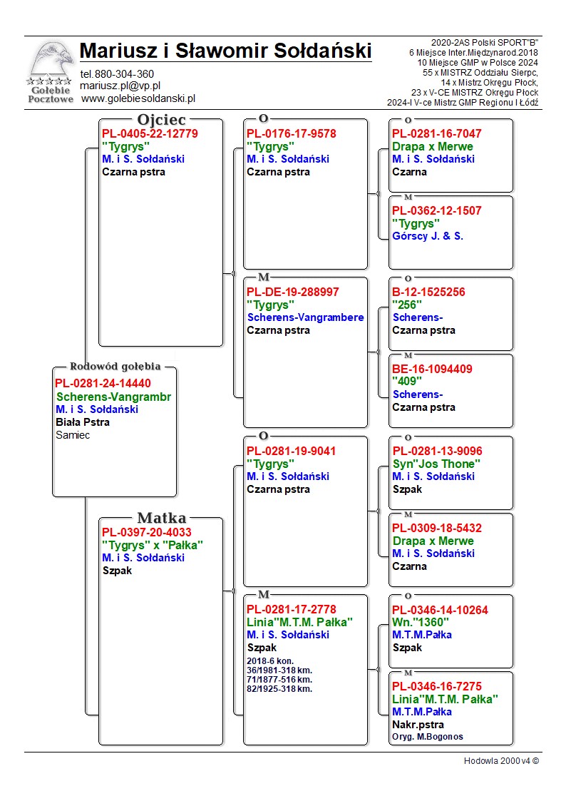 Oryginalny gołąb z hodowli Mariusz i Sławomir Sołdański. Samczyk z linii Scherens-Vangrambreren. Więcej informacji o gołębiu pod nr tel. Nasze wyniki w Mistrzostwie Polski 2018: 6 Miejsce w Intermistrzostwie Międzynarodowym - coeff. 151,73; 23 Miejsce GMP - 1874,73; 29 Miejsce Kat.B - coeff. 86,45. 1 Miejsce Gołąb Średni dystans-Konkurs Redakcji "Hodowca", 1 Miejsce Kat."B"-Konkurs Redakcji "Dobry Lot", 3 Miejsce Kat."D"-Konkurs Redakcji "Dobry Lot", 2 Miejsce "Mistrzostwo Asów Allround"-Konkurs Redakcji "Dobry Lot", 1 Miejsce Kat."B"-Konkurs Redakcji "Poradnik Hodowcy". 2019-Oddział Sierpc: Typowane Mistrz, Open I-vce Mistrz, Open 50 II-V-ce Mistrz, 1 i 3 Lotnik Roczny, Kat. A II V-ce Mistrz, Kat. B II V-ce Mistrz, Kat. D II V-ce Mistrz, Kat. GMP I v-Ce Mistrz, Kat. Inter. I V-ce Mistrz, Super. I V-ce Mistrz. Okręg Płock: II V-ce Mistrz Supermistrzostwo, I V-ce Mistrz GMP, II Lotnik. kat. B. 10 Gołębi w Reprezentacji Okręgu na Wystawę Ogółnopolską 2020. 2 AS POLSKI SPORT „B”-14,62 coef. 2020-Oddział Sierpc: Typowane Mistrz, Open I-vce Mistrz, Open 50 I-V-ce Mistrz, 1 Lotniczka Roczna, Kat. C Mistrz, Kat. M II V-ce Mistrz, Kat. D II V-ce Mistrz, Kat. GMP Mistrz, Kat. Inter. II V-ce Mistrz, Mistrz. Okręg Płock: Kat. GMP Mistrz , Kat.Roczne Mistrz, Kat. C-I Vce Mistrz , Kat. M - I Vce Mistrz Mistrz.Regionu I Łódż- V-ce Mistrz „Roczne” 2021- Supermistrz Oddziału Sierpc Mistrz Okręgu Płock Kat." Maraton" Supermistrz Okręgu Płock