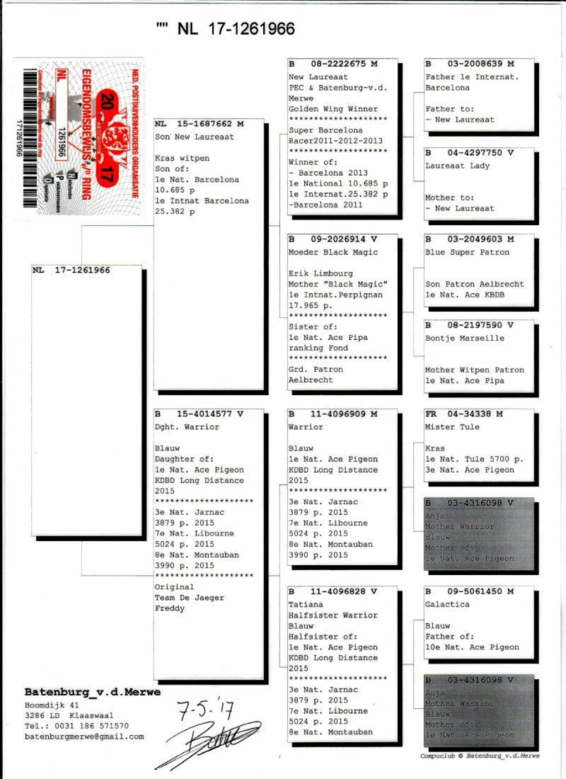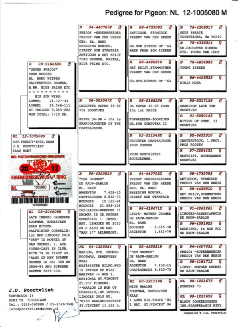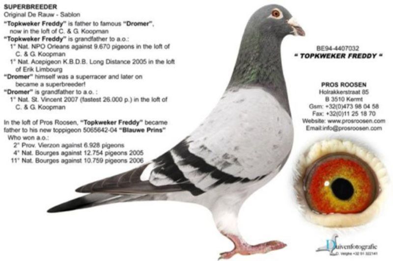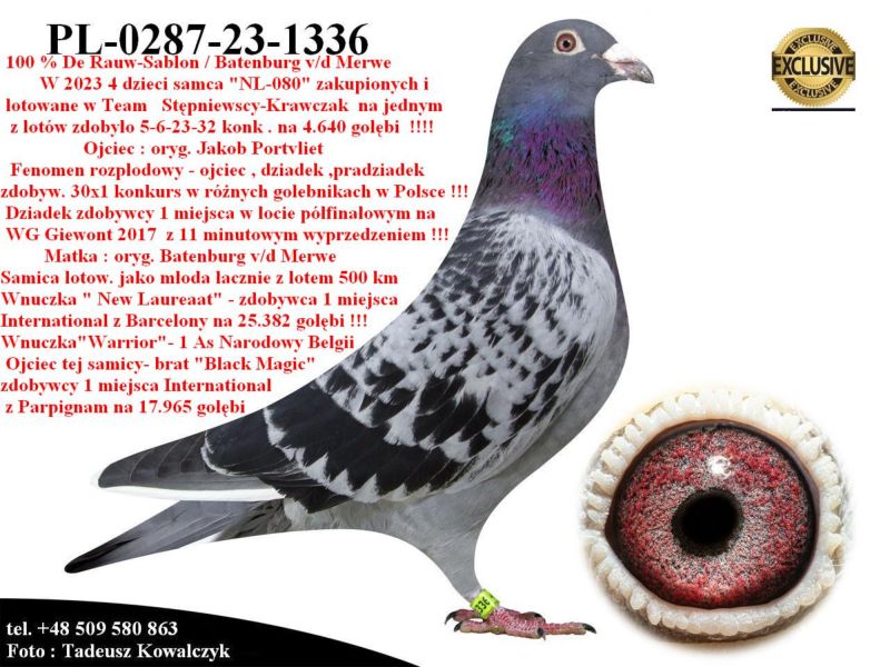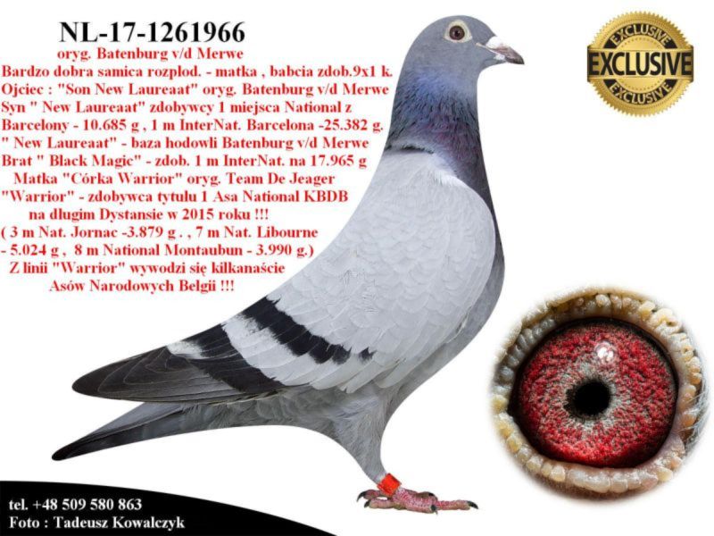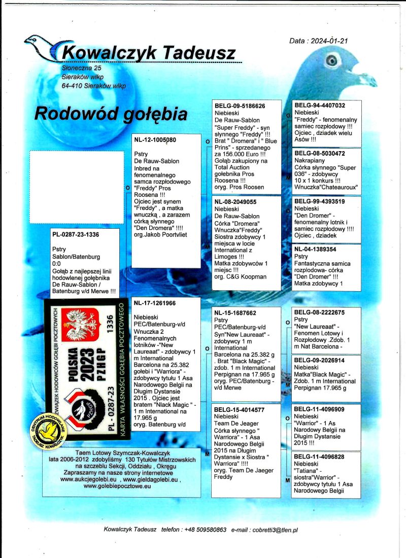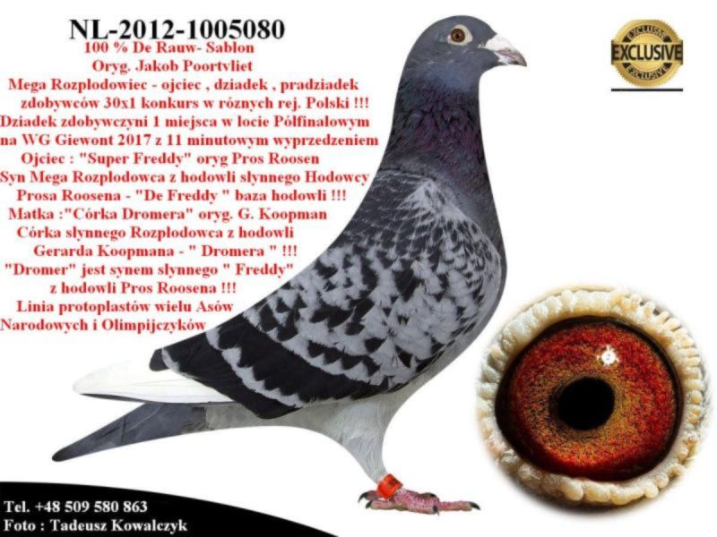 AUKCJA PROMOCYJNA (Cena obowiązuje wyłącznie na tej aukcji) Profesjonalna hodowla z wieloletnim doświadczeniem, posiadająca w swoim stadzie materiał najwyższej światowej klasy, wywodzący się od takich hodowców jak: Jan Hooymans, Gerard Koopman, Mike Ganus, Tjeerd & Jouke Elzinga, Gino Clicque, Jos Vercammen, Jelle Roziers, Bart Geerinckx, Batenburg – v/d Merwe, Altmiks – Pigeons, Jo & Florian Hendriks, Kornelis Winner Loft – linia „Romario”, W & F Ebben, Bert Braspenning, Dirk van den Bulck, Peter v/d Merwe, Jan van de Pasch, Van Elsacker-Jepsen, Roger Desmet – Matthijs, Arie Dijkstra, Leo Heremans, Pieter Veenstra, Gaby Vandenabeele, Karl-Heinz Wichert, Hardy Kruger, Helmut & Alfons Klaas, Gebr. Janssen. Najwyższej klasy materiał hodowlany – najlepsze linie danych Hodowców. Wszystkie wylicytowane gołębie będą dostarczane firmą kurierską.