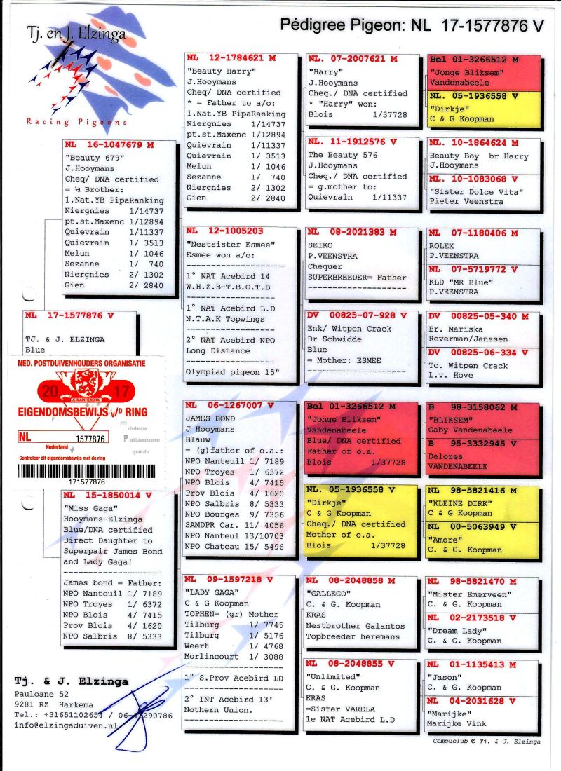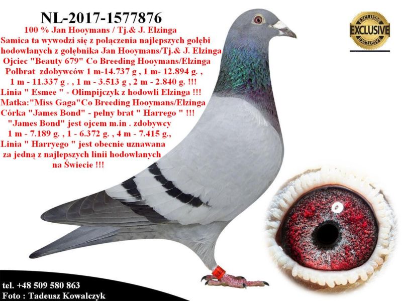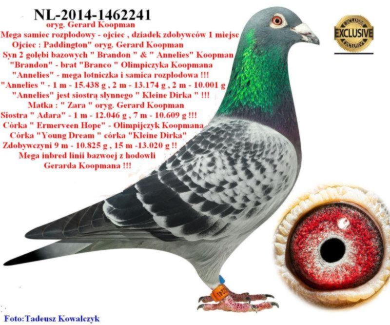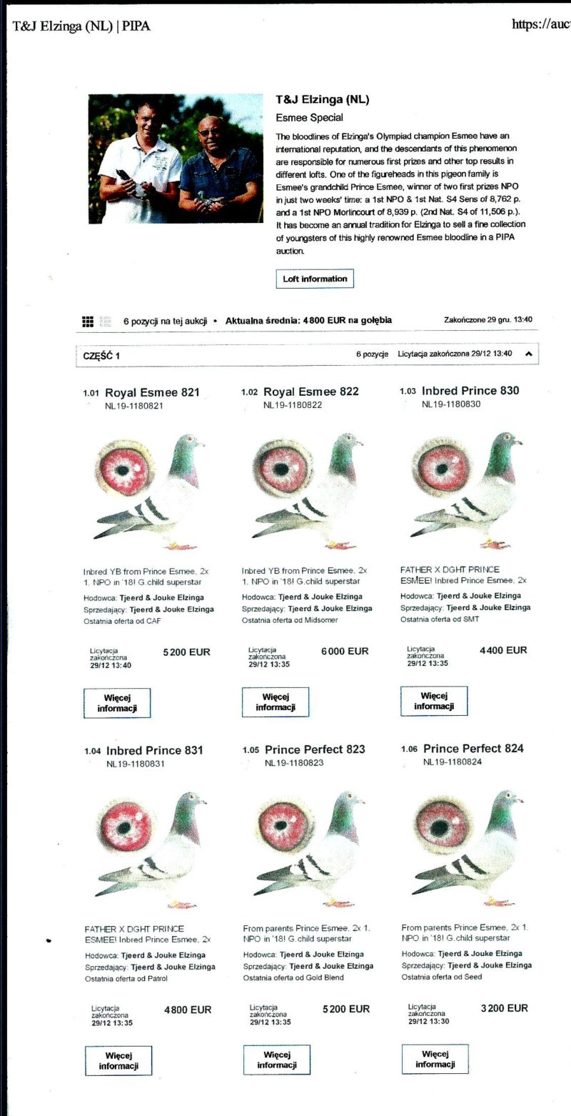 AUKCJA PROMOCYJNA (Cena obowiązuje wyłącznie na tej aukcji) Profesjonalna hodowla z wieloletnim doświadczeniem, posiadająca w swoim stadzie materiał najwyższej światowej klasy, wywodzący się od takich hodowców jak: Jan Hooymans, Gerard Koopman, Mike Ganus, Tjeerd & Jouke Elzinga, Gino Clicque, Jos Vercammen, Jelle Roziers, Bart Geerinckx, Batenburg – v/d Merwe, Altmiks – Pigeons, Jo & Florian Hendriks, Kornelis Winner Loft – linia „Romario”, W & F Ebben, Bert Braspenning, Dirk van den Bulck, Peter v/d Merwe, Jan van de Pasch, Van Elsacker-Jepsen, Roger Desmet – Matthijs, Arie Dijkstra, Leo Heremans, Pieter Veenstra, Gaby Vandenabeele, Karl-Heinz Wichert, Hardy Kruger, Helmut & Alfons Klaas, Gebr. Janssen. Najwyższej klasy materiał hodowlany – najlepsze linie danych Hodowców. Wszystkie wylicytowane gołębie będą dostarczane firmą kurierską.