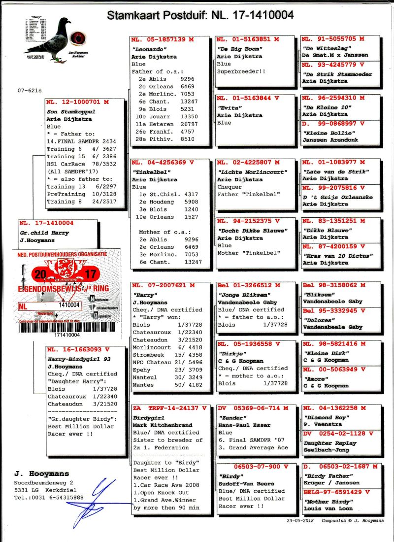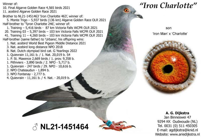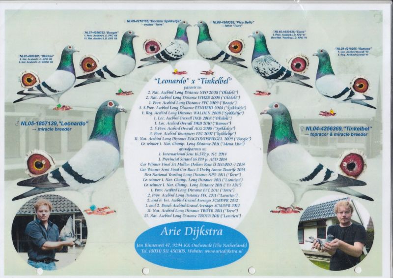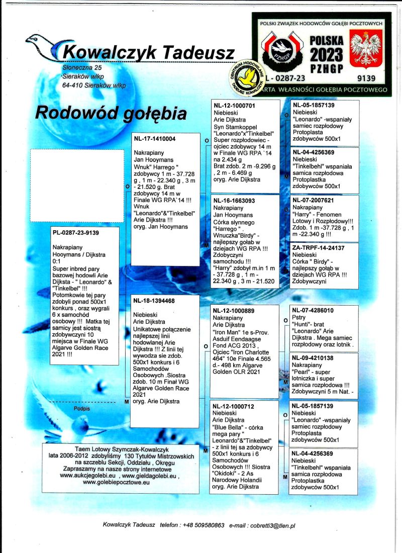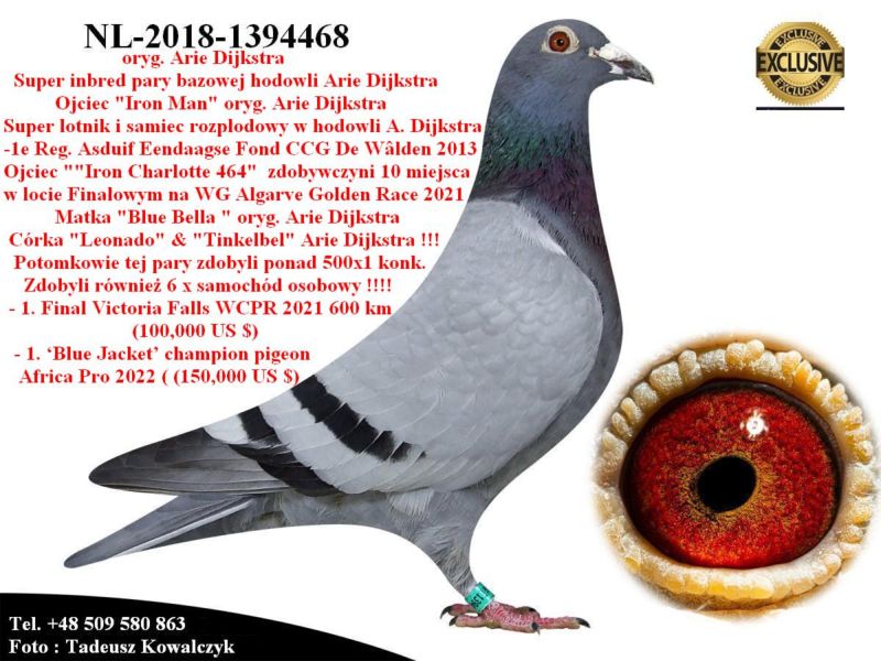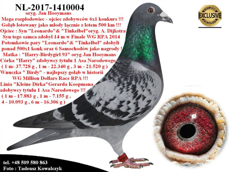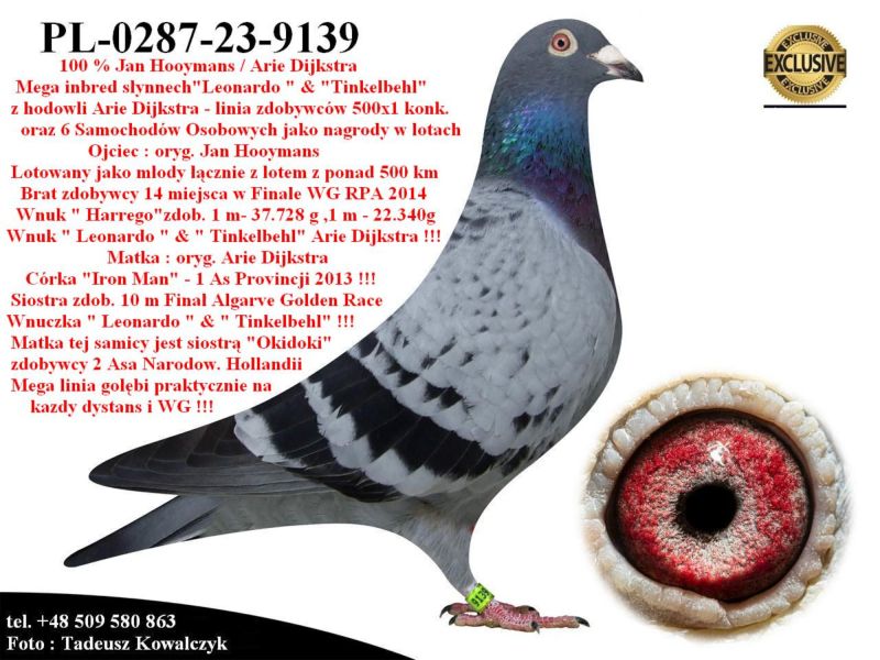 AUKCJA PROMOCYJNA (Cena obowiązuje wyłącznie na tej aukcji) Profesjonalna hodowla z wieloletnim doświadczeniem, posiadająca w swoim stadzie materiał najwyższej światowej klasy, wywodzący się od takich hodowców jak: Jan Hooymans, Gerard Koopman, Mike Ganus, Tjeerd & Jouke Elzinga, Gino Clicque, Jos Vercammen, Jelle Roziers, Bart Geerinckx, Batenburg – v/d Merwe, Altmiks – Pigeons, Jo & Florian Hendriks, Kornelis Winner Loft – linia „Romario”, W & F Ebben, Bert Braspenning, Dirk van den Bulck, Peter v/d Merwe, Jan van de Pasch, Van Elsacker-Jepsen, Roger Desmet – Matthijs, Arie Dijkstra, Leo Heremans, Pieter Veenstra, Gaby Vandenabeele, Karl-Heinz Wichert, Hardy Kruger, Helmut & Alfons Klaas, Gebr. Janssen. Najwyższej klasy materiał hodowlany – najlepsze linie danych Hodowców. Wszystkie wylicytowane gołębie będą dostarczane firmą kurierską.