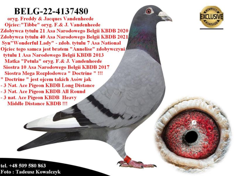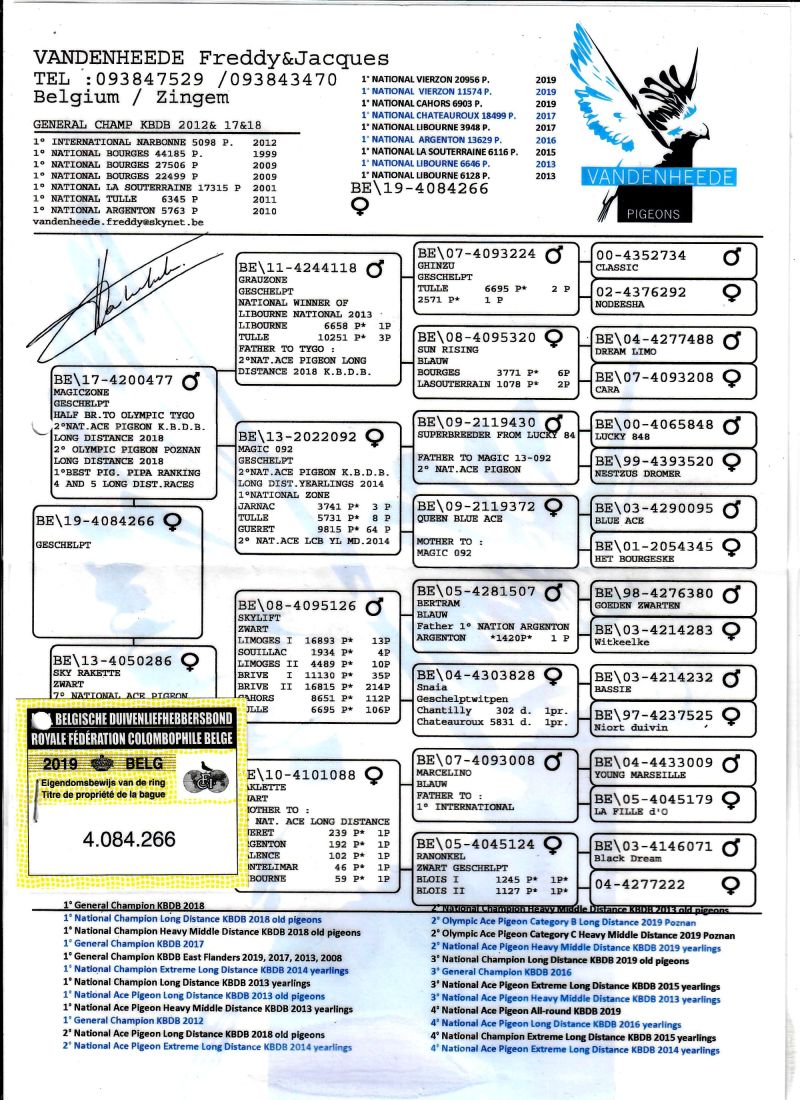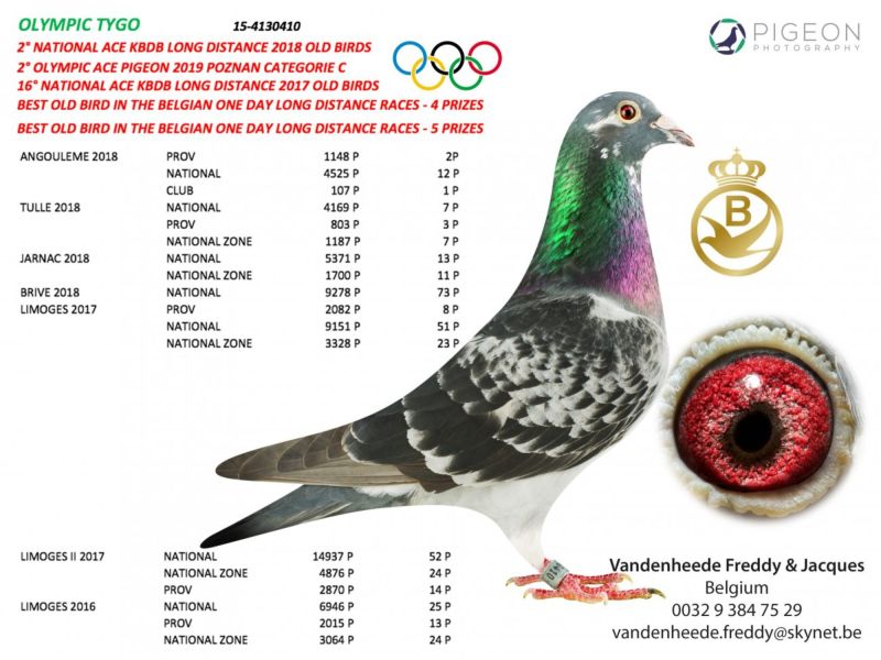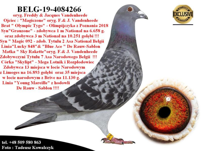 AUKCJA PROMOCYJNA (Cena obowiązuje wyłącznie na tej aukcji) Profesjonalna hodowla z wieloletnim doświadczeniem, posiadająca w swoim stadzie materiał najwyższej światowej klasy, wywodzący się od takich hodowców jak: Jan Hooymans, Gerard Koopman, Mike Ganus, Tjeerd & Jouke Elzinga, Gino Clicque, Jos Vercammen, Jelle Roziers, Bart Geerinckx, Batenburg – v/d Merwe, Altmiks – Pigeons, Jo & Florian Hendriks, Kornelis Winner Loft – linia „Romario”, W & F Ebben, Bert Braspenning, Dirk van den Bulck, Peter v/d Merwe, Jan van de Pasch, Van Elsacker-Jepsen, Roger Desmet – Matthijs, Arie Dijkstra, Leo Heremans, Pieter Veenstra, Gaby Vandenabeele, Karl-Heinz Wichert, Hardy Kruger, Helmut & Alfons Klaas, Gebr. Janssen. Najwyższej klasy materiał hodowlany – najlepsze linie danych Hodowców. Wszystkie wylicytowane gołębie będą dostarczane firmą kurierską.