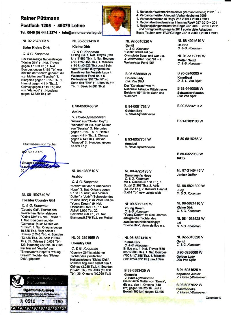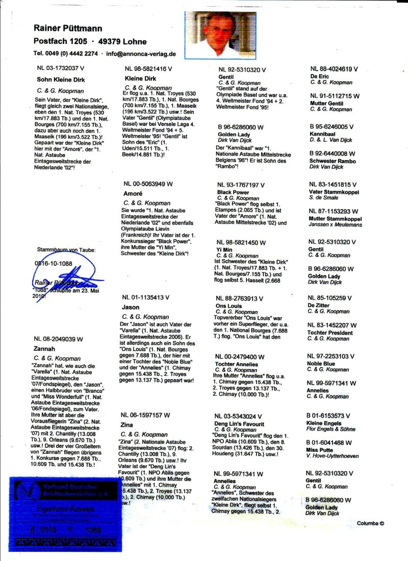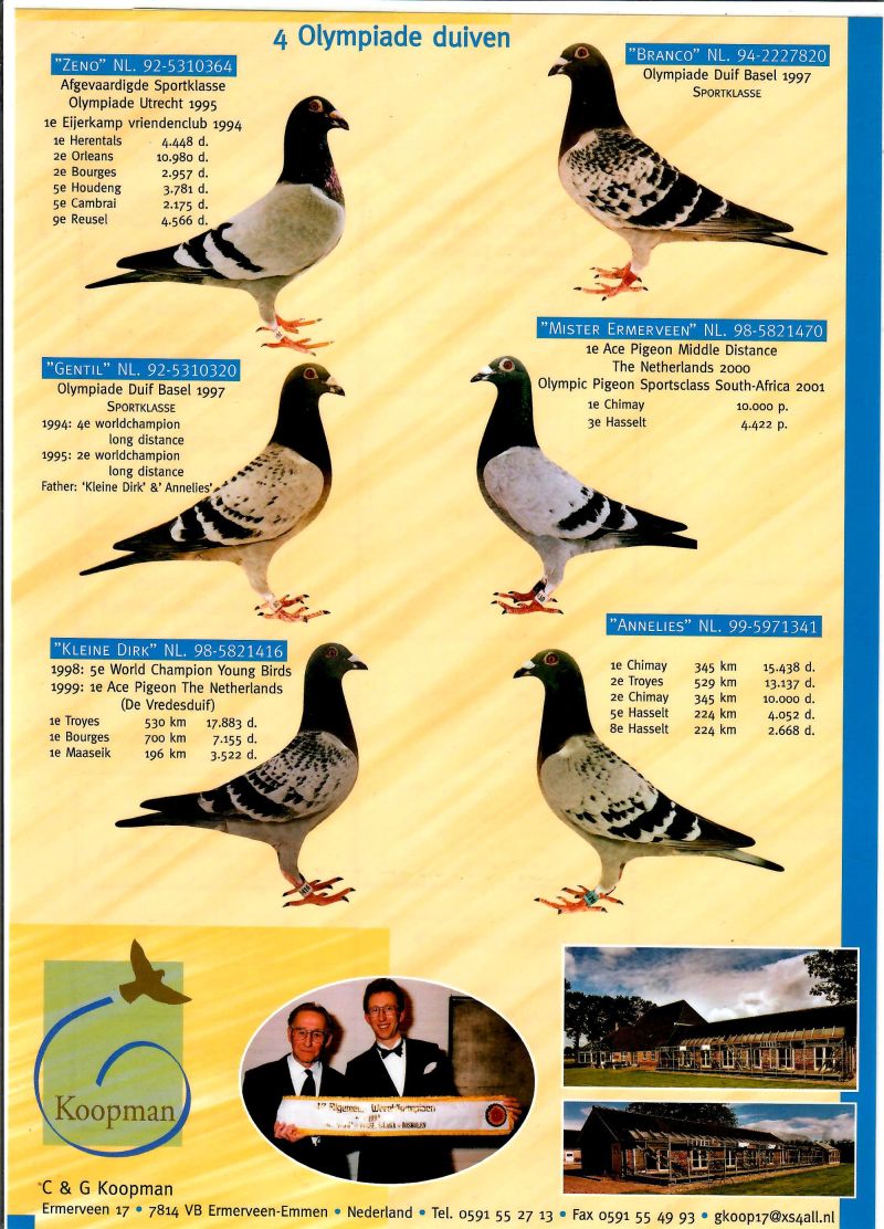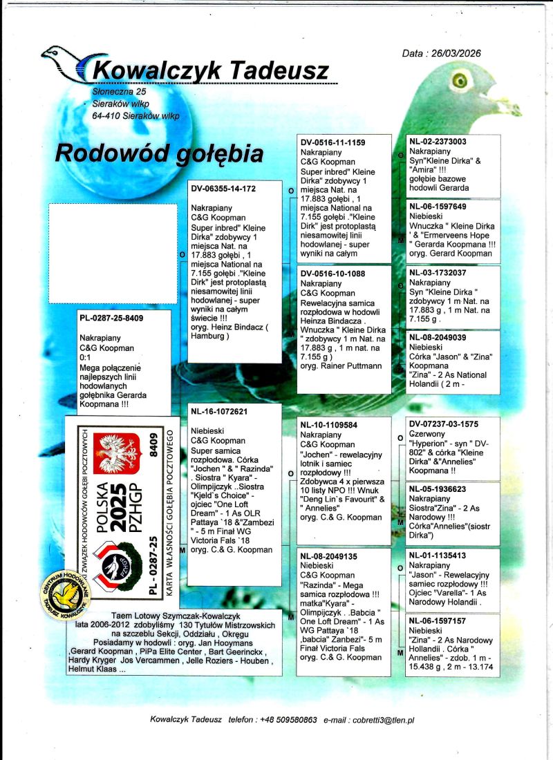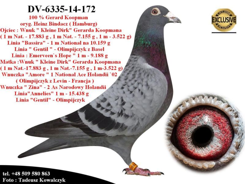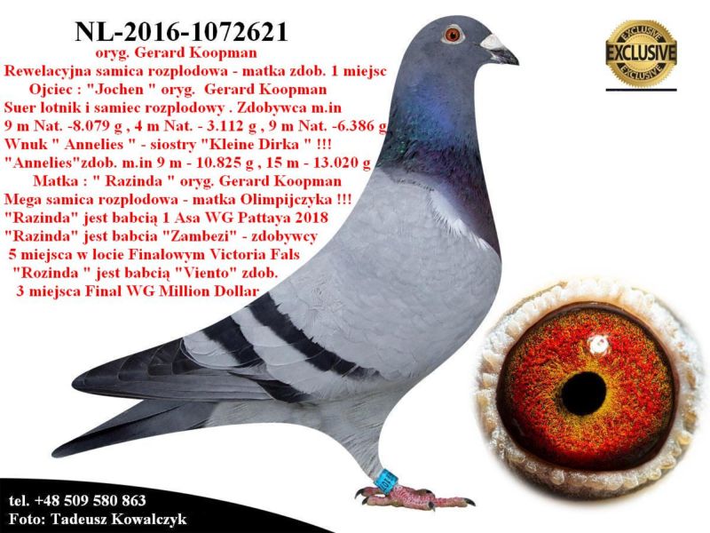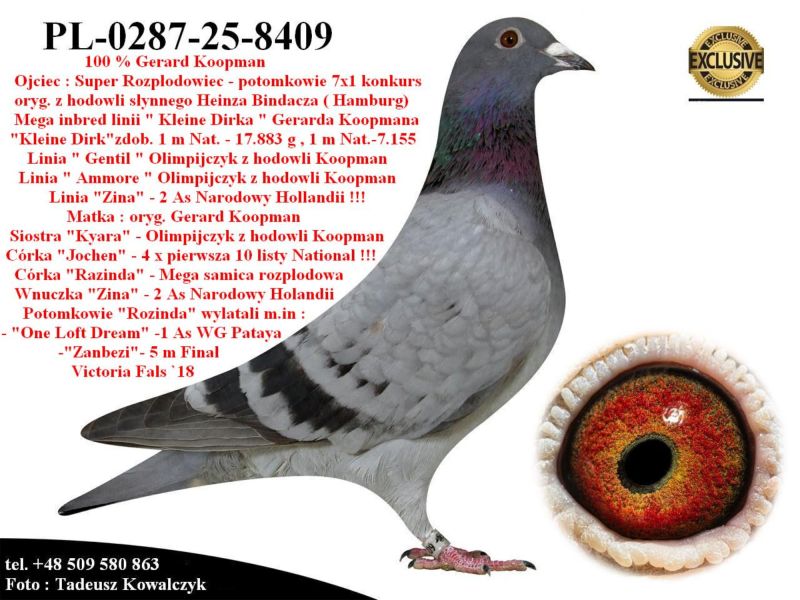 AUKCJA PROMOCYJNA (Cena obowiązuje wyłącznie na tej aukcji) Profesjonalna hodowla z wieloletnim doświadczeniem, posiadająca w swoim stadzie materiał najwyższej światowej klasy, wywodzący się od takich hodowców jak: Jan Hooymans, Gerard Koopman, Mike Ganus, Tjeerd & Jouke Elzinga, Gino Clicque, Jos Vercammen, Jelle Roziers, Bart Geerinckx, Batenburg – v/d Merwe, Altmiks – Pigeons, Jo & Florian Hendriks, Kornelis Winner Loft – linia „Romario”, W & F Ebben, Bert Braspenning, Dirk van den Bulck, Peter v/d Merwe, Jan van de Pasch, Van Elsacker-Jepsen, Roger Desmet – Matthijs, Arie Dijkstra, Leo Heremans, Pieter Veenstra, Gaby Vandenabeele, Karl-Heinz Wichert, Hardy Kruger, Helmut & Alfons Klaas, Gebr. Janssen. Najwyższej klasy materiał hodowlany – najlepsze linie danych Hodowców. Wszystkie wylicytowane gołębie będą dostarczane firmą kurierską.
