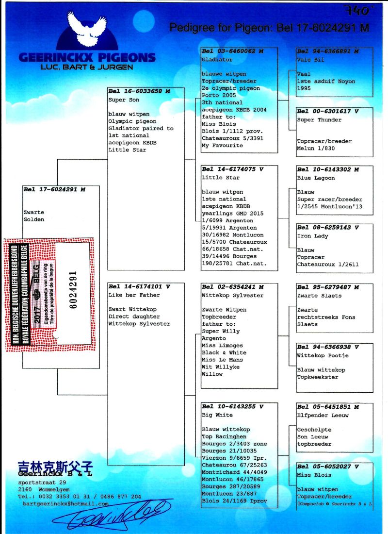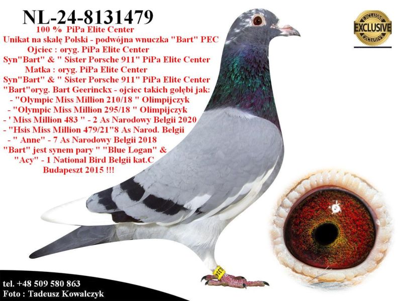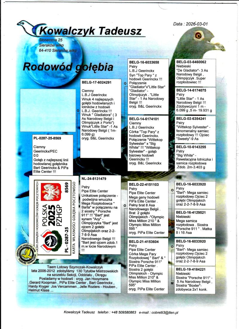 AUKCJA PROMOCYJNA (Cena obowiązuje wyłącznie na tej aukcji) Profesjonalna hodowla z wieloletnim doświadczeniem, posiadająca w swoim stadzie materiał najwyższej światowej klasy, wywodzący się od takich hodowców jak: Jan Hooymans, Gerard Koopman, Mike Ganus, Tjeerd & Jouke Elzinga, Gino Clicque, Jos Vercammen, Jelle Roziers, Bart Geerinckx, Batenburg – v/d Merwe, Altmiks – Pigeons, Jo & Florian Hendriks, Kornelis Winner Loft – linia „Romario”, W & F Ebben, Bert Braspenning, Dirk van den Bulck, Peter v/d Merwe, Jan van de Pasch, Van Elsacker-Jepsen, Roger Desmet – Matthijs, Arie Dijkstra, Leo Heremans, Pieter Veenstra, Gaby Vandenabeele, Karl-Heinz Wichert, Hardy Kruger, Helmut & Alfons Klaas, Gebr. Janssen. Najwyższej klasy materiał hodowlany – najlepsze linie danych Hodowców. Wszystkie wylicytowane gołębie będą dostarczane firmą kurierską.