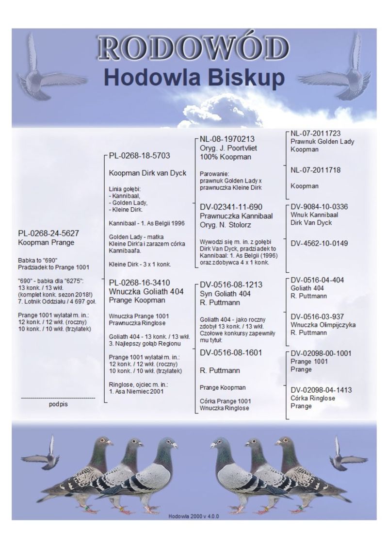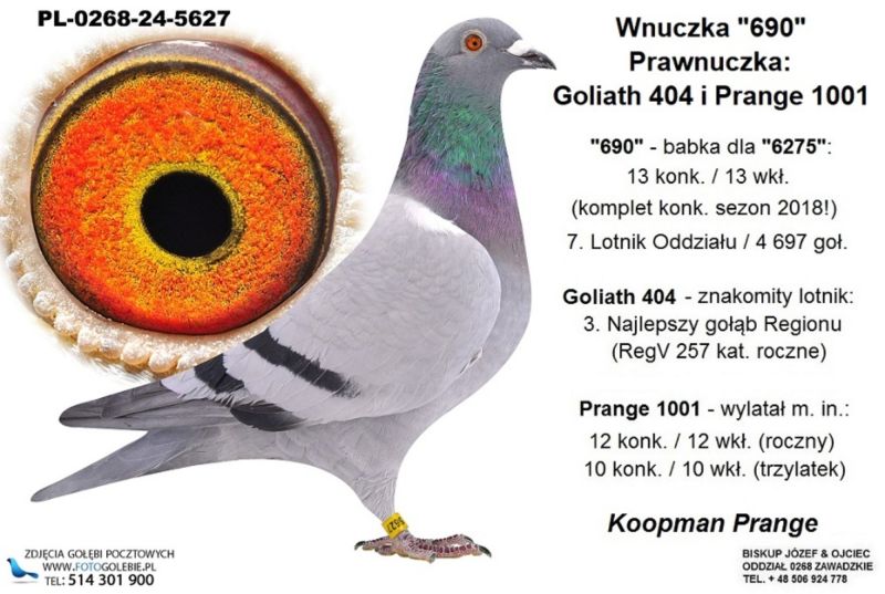 Babka to "690"; Pradziadek to Prange 1001; "690" - babka dla "6275": 13 konk. / 13 wkł., (komplet konk. sezon 2018!), 7. Lotnik Oddziału / 4 697 goł.; Prange 1001 wylatał m. in.: 12 konk. / 12 wkł. (roczny), 10 konk. / 10 wkł. (trzylatek) /// Koszt wysyłki 150 zł ///