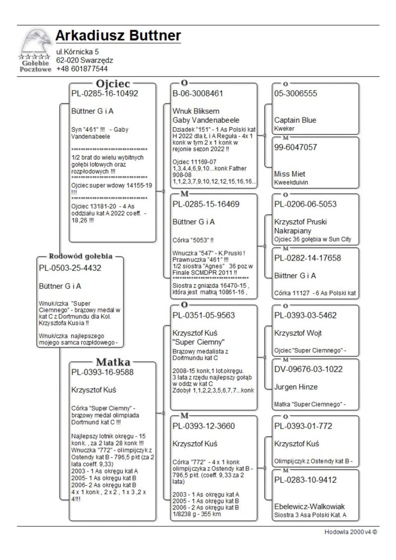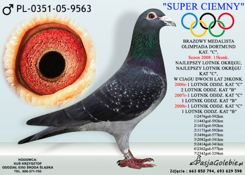 raczej samczyk wnuk dwóch wybitnych samców - 9563 - brązowy medalista w kat C z Dortmundu dla Kol K.Kusia oraz 461 - jednego z najlepszych rozpłodowców w Polsce ! "461" najważniejsze referencje "461" najważniejsze referencje z 2025/2026 roku: Prawnuk 5510- Kolegi Jacka Orszulika 2 As Polski kat A - kandydat na Olimpiadę 2026 w Dortmundzie !!! ... z 2024 roku: 1 As Rejonu z 8 lotów rejonowych - prawnuczka 461 u Kol Adama Gasperowicza, prawnuk "461" wygrał finał na WG Podhale wygrywając 50 000 dla Kolegi Bogdana Bieli !- liczba jedynek jego wnuków , prawnuków i oczywiście dzieci będzie około stu a kilkadziesiąt gołębi z 461 zajmowało top 10 w kat As w różnych kategoriach w różnych okręgach w Polsce- tylko w 2022 roku w 9 różnych oddziałach przeważnie prawnuki zdobywały 1 lokatę w oddz !!! Jego wnuczka została też na olimpiadzie w tym roku 4 gołębiem świata w kat H dla Kol Łukasza Reguły. !! Na screenie przykład jak potrafią siadać gołębie w oddz z linii 461 ... 3-prawnuk,4 -wnuk , 5-wnuk , 6 - roczna wnuczka - kat A 9 z groszem ma , 7 wnuk , 11 - wnuk oraz 15 - wnuk 461. oraz kolejny lot z 2020 roku : 1,2,3,5,7,8 wnuk oraz 15 prawnuk ? do tego roczna samiczka Kolegów Piotra I Marcina Żureckich z Kępna została 6 asem Polski w kat G ...tak leciała... 2 na 5200 g ze 174 km 8 na 4573 z 219 km 8 na 3583 g z 324 km 8 na 1764 g z 324 g 21 na 4535 g z 549 km - rej - coeff jak widać na zdjęciu 13,54 miała też szósty super lot była 25 na 4984 g coeff 5,02 1 goląb z Extra finału na WG Giewont 2022 dla Teamu Chudy-Molek to też linia "461" ojciec to syn mojej super wdowy 2161-12 ,, Dwie Prawnuczki .... u Kol Kazimierza Goździejewskiego ( jedna w kat M w 2023 roku miała coeff 4,84 ( 1 as okręgu Wałbrzych a druga w 2024 roku 2,58 - 2 x 1 na oddział (2 as Polski kat M w/g miesięcznika "Hodowca") - w kat "I" - coeff 9 z haczykiem), "461" to też pradziadek PL-0122-22-2219 - w 2 sezony na 21 wkładań 20 konkursów - kat A coeff 9,08 a z dwóch lat do wystaw kat A-74,86 , kat B-65,94 a kat D-72,20 W 2023 roku zdobył 1 konk na ok 4100 gołębi z miejsc Sulechów a w 2024 roku 2 x 2 konk w oddz !!! oraz pradziadek PL-0122-22-5510 w kat A w 2024 roku uzyskał coeff. 4,75 Zdobył też 1 konk na oddz z miejsc. Brzeg Dolny na 4322 gołębie !! Został też 4 Asem Polski kat krótki dystans 2024 z coeff 17 z groszem z 5 lotów do kat A właśnie dla Kolegi Jacka Orszulika !!! oraz wiele,wiele innych.....od 2017 roku 30x mistrzostwo oddz w różnych kategoriach w tym 2019-2021 3 x z rzędu supermistrzostwo oddziału Poznań, więcej info 601 877 544