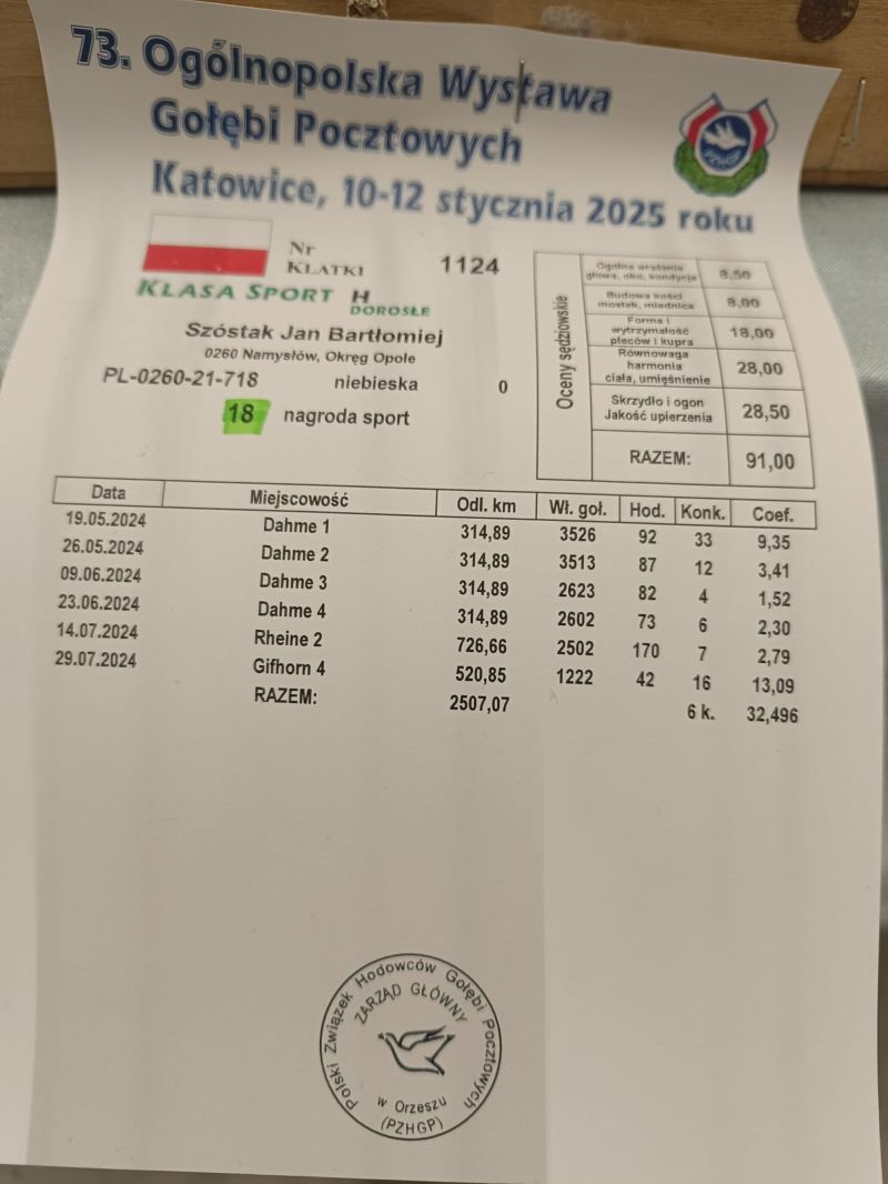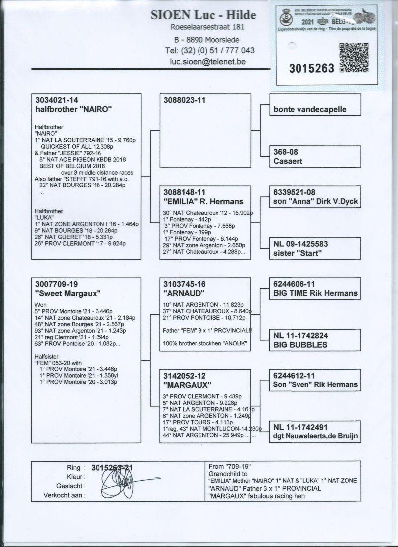 Wnuk super pary rozpłodowej Ludo Claessens - "791" x "870"(córka Meeuwke 12) ! Prawnuk "Margoux" - super wdowy u H & L Sioen !! Linia "Cameron" - 2 x 1 Narodowy !!! "791" - ojciec "ZigZag McQueen" - 117 poz w finale SAMDPR , ojciec "Lotniskowej" , najlepszej samicy rozpłodowej u Kol Krzyśka Kusia oraz dziadek 8755 - rezerwa na olimpiadę w kat olimpijskiej maraton oraz ojciec , dziadek i pradziadek wielu wybitnych gołębi rozpłodowych i lotowych na wielu gołębnikach !! "870" - matka 14196 - 2 as oddz kat A , 8701 - ojciec 2 x 10 gołąb z finału WG Kuźnica 2015 i 2016 , i wielu wielu innych innych.Babka 1 gołębia z finału WG Podhale 2024 dla Kol. Bogdana Bieli. Babka super samca rozpłodowego u Kol Jacka Orszulika, matka "17915" - wybitna samica rozpłodowa - babka dwóch mega lotników na PLGP u Kol Krzysztofa Mrowieca oraz babka 2 super samic Lotowych u Kol Kazimierza Goździejewskiego ( jedna w kat M w 2023 roku miała coeff 4,84 a druga w 2024 roku 2,58 - 2 x 1 na oddział - w kat "I" - coeff 9 z haczykiem) od 2017 roku 30x mistrzostwo oddz w różnych kategoriach w tym 2019-2021 3 x z rzędu supermistrzostwo oddziału Poznań, więcej lub 601 877 544