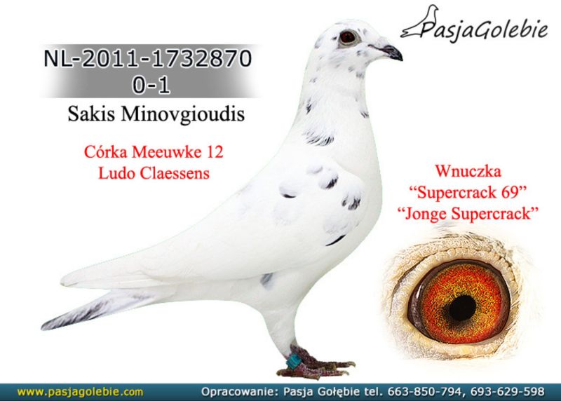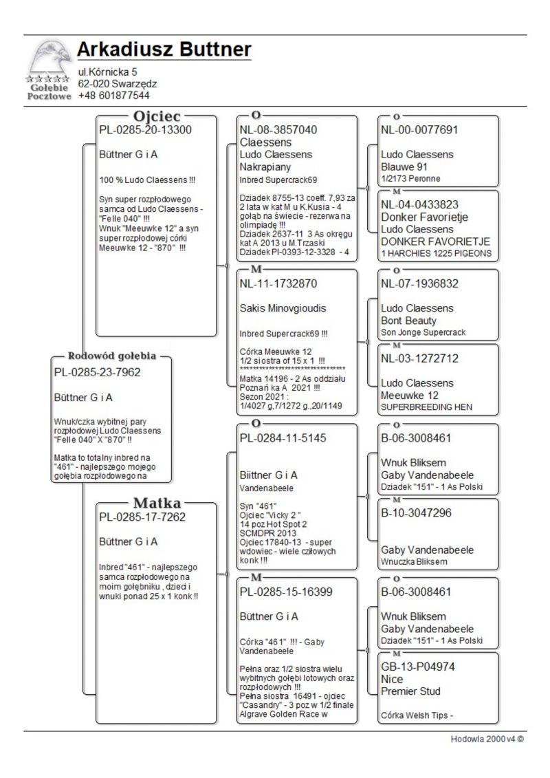 Ojciec to syn wybitnej pary rozpłodowej "Felle 040" x "870" a matka to inbredka na "461" "Felle 040" ojciec m.in 8755 , który dla Kol . Krzyśka Kusia wylatał 4 wynik w Polsce w kat olimpijskie E i był gołębiem rezerwowym na olimpiadę. Jest też pradziadkiem PL-0122-22-2219 - w 2 sezony na 21 wkładań 20 konkursów - kat A coeff 9,08 a z dwóch lat do wystaw kat A-74,86 , kat B-65,94 a kat D-72,20 W 2023 roku zdobył 1 konk na ok 4100 gołębi z miejsc Sulechów a w 2024 roku 2 x 2 konk w oddz !!! oraz PL-0122-22-5510 w kat A w 2024 roku uzyskał coeff. 4,75 Zdobył też 1 konk na oddz z miejsc. Brzeg Dolny na 4322 gołębie !! Został też 4 Asem Polski kat krótki dystans 2024 z coeff 17 z groszem z 5 lotów do kat A właśnie oraz także pradziadkiem PL-0122-21-2246 - na 16 wkładań 16 konkursów i w 2024 roku uzyskał kat A - 10,32 coeff , kat B - 8,64 coeff a z dwóch lat do wystaw kat A 53 coeff i został na ostatniej wystawie TYTUŁ 17 ASA POLSKI , w kat olimp B - 67,76 coeff a w kat D - 53,20 coeff a w 2024 roku w kat średni dystans został w/g konkursu redakcji ZOSTAŁ 9 ASEM A TAKŻE WYGRAŁ Z LOTU OKRĘGOWEGO NA 8137 GOŁĘBI Z LOTU ŚWINOUJŚCIE + 500 KM i pradziadkiem PL-0122-22-5118 uzyskał w tym 2024 roku coeff 5,24 w kat A oraz w 2023 roku 2 konk na oddział z lotu Bieganów na ok 3000 gołębi oraz 2 konkurs na oddział w 2024 rokuz miejscowości Kościan na około 4300 gołębi dla Kolegi Jacka Orszulika !!!"Felle" jest też ojcem dziadkiem wielu innych super gołębi lotowych - asów na szczeblu sekcji , oddziału i okręgu oraz gołębi ropzłodowych ! "870" - matka 14196 - 2 as oddz kat A , 8701 - ojciec 2 x 10 gołąb z finału WG Kuźnica 2015 i 2016 , i wielu wielu innych innych.Babka 1 gołębia z finału WG Podhale 2024 dla Kol. Bogdana Bieli. Babka super samca rozpłodowego u Kol Jacka Orszulika, matka "17915" - "17915" - wybitna samica rozpłodowa - babka dwóch mega lotników na PLGP u Kol Krzysztofa Mrowieca oraz babka 2 super samic Lotowych u Kol Kazimierza Goździejewskiego ( jedna w kat M w 2023 roku miała coeff 4,84 a druga w 2024 roku 2,58 - 2 x 1 na oddział - w kat "I" - coeff 9 z haczykiem) "461" najważniejsze referencje z 2025/2026 roku: Prawnuk 5110- Kolegi Jacka Orszulika 2 As Polski kat A - kandydat na Olimpiadę 2026 w Dortmundzie ! Z 2024 roku: 1 As Rejonu z 8 lotów rejonowych - prawnuczka 461 u Kol Adama Gasperowicza, prawnuk "461" wygrał finał na WG Podhale wygrywając 50 000 dla Kolegi Bogdana Bieli !- liczba jedynek jego wnuków , prawnuków i oczywiście dzieci będzie około stu a kilkadziesiąt gołębi z 461 zajmowało top 10 w kat As w różnych kategoriach w różnych okręgach w Polsce- tylko w 2022 roku w 9 różnych oddziałach przeważnie prawnuki zdobywały 1 lokatę w oddz !!! Jego wnuczka została też na olimpiadzie w tym roku 4 gołębiem świata w kat H dla Kol Łukasza Reguły. !! Na screenie przykład jak potrafią siadać gołębie w oddz z linii 461 ... 3-prawnuk,4 -wnuk , 5-wnuk , 6 - roczna wnuczka - kat A 9 z groszem ma , 7 wnuk , 11 - wnuk oraz 15 - wnuk 461. oraz kolejny lot z 2020 roku : 1,2,3,5,7,8 wnuk oraz 15 prawnuk ? do tego roczna samiczka Kolegów Piotra I Marcina Żureckich z Kępna została 6 asem Polski w kat G ...tak leciała... 2 na 5200 g ze 174 km 8 na 4573 z 219 km 8 na 3583 g z 324 km 8 na 1764 g z 324 g 21 na 4535 g z 549 km - rej - coeff jak widać na zdjęciu 13,54 miała też szósty super lot była 25 na 4984 g coeff 5,02 1 goląb z Extra finału na WG Giewont 2022 dla Teamu Chudy-Molek to też linia "461" ojciec to syn mojej super wdowy 2161-12 ,, Dwie Prawnuczki .... u Kol Kazimierza Goździejewskiego ( jedna w kat M w 2023 roku miała coeff 4,84 ( 1 as okręgu Wałbrzych a druga w 2024 roku 2,58 - 2 x 1 na oddział (2 as Polski kat M w/g miesięcznika "Hodowca") - w kat "I" - coeff 9 z haczykiem), "461" to też pradziadek PL-0122-22-2219 - w 2 sezony na 21 wkładań 20 konkursów - kat A coeff 9,08 a z dwóch lat do wystaw kat A-74,86 , kat B-65,94 a kat D-72,20 W 2023 roku zdobył 1 konk na ok 4100 gołębi z miejsc Sulechów a w 2024 roku 2 x 2 konk w oddz !!! oraz pradziadek PL-0122-22-5510 w kat A w 2024 roku uzyskał coeff. 4,75 Zdobył też 1 konk na oddz z miejsc. Brzeg Dolny na 4322 gołębie !! Został też 4 Asem Polski kat krótki dystans 2024 z coeff 17 z groszem z 5 lotów do kat A właśnie dla Kolegi Jacka Orszulika !!! oraz wiele,wiele innych.....od 2017 roku 30x mistrzostwo oddz w różnych kategoriach w tym 2019-2021 3 x z rzędu supermistrzostwo oddziału Poznań, więcej info 601 877 544
