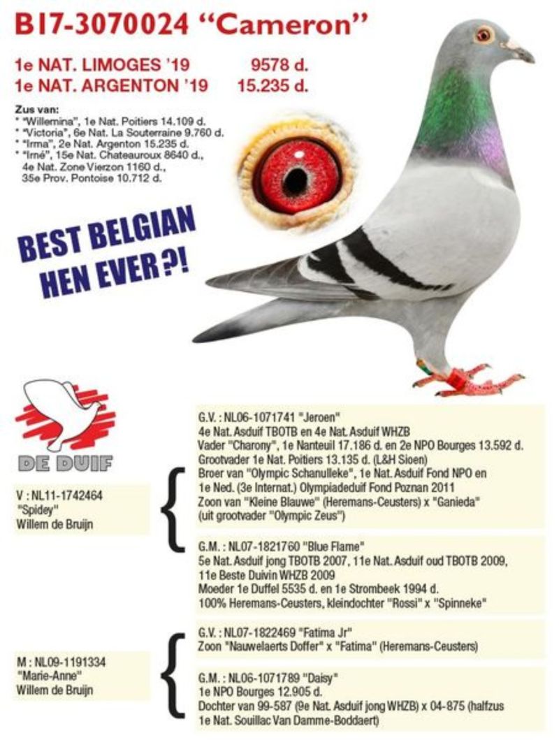 Piękny samczyk prawnuk, trzech moich podstawowych gołębi rozpłodowych: 461, 791 x 870 także pokrewieństwo dalsze na super parę Felle 040 x Tipsowa. Linia Cameron - 2 x 1 NARODOWY NA PONAD 9 I 15 TYŚ GOŁĘBI dla H & L Sioen !! Linia "Cameron" - 2 x 1 Narodowy w jednym roku na ponad 9 oraz 15 tyś g. - jest to wnuczka "Jeroen" - wybitny samiec rozpłodowy u W. de Bruijn , "791" - ojciec "ZigZag McQueen" - 117 poz w finale SAMDPR , ojciec "Lotniskowej" , najlepszej samicy rozpłodowej u Kol Krzyśka Kusia oraz dziadek 8755 - rezerwa na olimpiadę w kat olimpijskiej maraton . Jest też pradziadkiem PL-0122-22-2219 - w 2 sezony na 21 wkładań 20 konkursów - kat A coeff 9,08 a z dwóch lat do wystaw kat A-74,86 , kat B-65,94 a kat D-72,20 W 2023 roku zdobył 1 konk na ok 4100 gołębi z miejsc Sulechów a w 2024 roku 2 x 2 konk w oddz !!! oraz PL-0122-22-5510 w kat A w 2024 roku uzyskał coeff. 4,75 Zdobył też 1 konk na oddz z miejsc. Brzeg Dolny na 4322 gołębie !! Został też 4 Asem Polski kat krótki dystans 2024 z coeff 17 z groszem z 5 lotów do kat A właśnie dla Kolegi Jacka Orszulika !!!oraz ojciec , dziadek i pradziadek wielu wybitnych gołębi rozpłodowych i lotowych na wielu gołębnikach !! "327" - babka 1 i 4 Asa WG Kużnica -16169-15 - 1 As WG Kuźnica - 4 poz w Finale - sprzedany za 8600 Euro na pipa.be....Babka 1 ASA odziału 0500 Chorzów Bytom Świętochłowice z 13 konkursami (7 samicą Rejonu Radzionków na ponad 17000 zgłoszonych gołębi !!) "Felle 040" dziadek m.in 8755 , który dla Kol . Krzyśka Kusia wylatał 4 wynik w Polsce w kat olimpijskie E i był gołębiem rezerwowym na olimpiadę. Jest też pradziadkiem PL-0122-22-2219 - w 2 sezony na 21 wkładań 20 konkursów - kat A coeff 9,08 a z dwóch lat do wystaw kat A-74,86 , kat B-65,94 a kat D-72,20 W 2023 roku zdobył 1 konk na ok 4100 gołębi z miejsc Sulechów a w 2024 roku 2 x 2 konk w oddz !!! oraz PL-0122-22-5110 w kat A w 2024 roku uzyskał coeff. 4,75 Zdobył też 1 konk na oddz z miejsc. Brzeg Dolny na 4322 gołębie !! Został też 4 Asem Polski kat krótki dystans 2024 z coeff 17 z groszem z 5 lotów do kat A właśnie oraz także pradziadkiem PL-0122-21-2246 - na 16 wkładań 16 konkursów i w 2024 roku uzyskał kat A - 10,32 coeff , kat B - 8,64 coeff a z dwóch lat do wystaw kat A 53 coeff i został na ostatniej wystawie TYTUŁ 17 ASA POLSKI , w kat olimp B - 67,76 coeff a w kat D - 53,20 coeff a w 2024 roku w kat średni dystans został w/g konkursu redakcji ZOSTAŁ 9 ASEM A TAKŻE WYGRAŁ Z LOTU OKRĘGOWEGO NA 8137 GOŁĘBI Z LOTU ŚWINOUJŚCIE + 500 KM i pradziadkiem PL-0122-22-5118 uzyskał w tym 2024 roku coeff 5,24 w kat A oraz w 2023 roku 2 konk na oddział z lotu Bieganów na ok 3000 gołębi oraz 2 konkurs na oddział w 2024 rokuz miejscowości Kościan na około 4300 gołębi dla Kolegi Jacka Orszulika !!!"Felle" jest też ojcem dziadkiem wielu innych super gołębi lotowych - asów na szczeblu sekcji , oddziału i okręgu oraz gołębi ropzłodowych ! "870" - matka 14196 - 2 as oddz kat A , 8701 - ojciec 2 x 10 gołąb z finału WG Kuźnica 2015 i 2016 , i wielu wielu innych innych.Babka 1 gołębia z finału WG Podhale 2024 dla Kol. Bogdana Bieli. Babka super samca rozpłodowego u Kol Jacka Orszulika, matka "17915" - "17915" - wybitna samica rozpłodowa - babka dwóch mega lotników na PLGP u Kol Krzysztofa Mrowieca oraz babka 2 super samic Lotowych u Kol Kazimierza Goździejewskiego ( jedna w kat M w 2023 roku miała coeff 4,84 a druga w 2024 roku 2,58 - 2 x 1 na oddział - w kat "I" - coeff 9 z haczykiem) "461" najważniejsze referencje z 2025/2026 roku: Prawnuk 5110- Kolegi Jacka Orszulika 2 As Polski kat A - olimpijczyk z Dortmundu w kat A ! 2024 roku: 1 As Rejonu z 8 lotów rejonowych - prawnuczka 461 u Kol Adama Gasperowicza, prawnuk "461" wygrał finał na WG Podhale wygrywając 50 000 dla Kolegi Bogdana Bieli !- liczba jedynek jego wnuków , prawnuków i oczywiście dzieci będzie około stu a kilkadziesiąt gołębi z 461 zajmowało top 10 w kat As w różnych kategoriach w różnych okręgach w Polsce- tylko w 2022 roku w 9 różnych oddziałach przeważnie prawnuki zdobywały 1 lokatę w oddz !!! Jego wnuczka została też na olimpiadzie w tym roku 4 gołębiem świata w kat H dla Kol Łukasza Reguły. !! Na screenie przykład jak potrafią siadać gołębie w oddz z linii 461 ... 3-prawnuk,4 -wnuk , 5-wnuk , 6 - roczna wnuczka - kat A 9 z groszem ma , 7 wnuk , 11 - wnuk oraz 15 - wnuk 461. oraz kolejny lot z 2020 roku : 1,2,3,5,7,8 wnuk oraz 15 prawnuk ? do tego roczna samiczka Kolegów Piotra I Marcina Żureckich z Kępna została 6 asem Polski w kat G ...tak leciała... 2 na 5200 g ze 174 km 8 na 4573 z 219 km 8 na 3583 g z 324 km 8 na 1764 g z 324 g 21 na 4535 g z 549 km - rej - coeff jak widać na zdjęciu 13,54 miała też szósty super lot była 25 na 4984 g coeff 5,02 1 goląb z Extra finału na WG Giewont 2022 dla Teamu Chudy-Molek to też linia "461" ojciec to syn mojej super wdowy 2161-12 ,, Dwie Prawnuczki .... u Kol Kazimierza Goździejewskiego ( jedna w kat M w 2023 roku miała coeff 4,84 ( 1 as okręgu Wałbrzych a druga w 2024 roku 2,58 - 2 x 1 na oddział (2 as Polski kat M w/g miesięcznika "Hodowca") - w kat "I" - coeff 9 z haczykiem), "461" to też pradziadek PL-0122-22-2219 - w 2 sezony na 21 wkładań 20 konkursów - kat A coeff 9,08 a z dwóch lat do wystaw kat A-74,86 , kat B-65,94 a kat D-72,20 W 2023 roku zdobył 1 konk na ok 4100 gołębi z miejsc Sulechów a w 2024 roku 2 x 2 konk w oddz !!! oraz pradziadek PL-0122-22-5510 w kat A w 2024 roku uzyskał coeff. 4,75 Zdobył też 1 konk na oddz z miejsc. Brzeg Dolny na 4322 gołębie !! Został też 4 Asem Polski kat krótki dystans 2024 z coeff 17 z groszem z 5 lotów do kat A właśnie dla Kolegi Jacka Orszulika !!! oraz wiele,wiele innych.....od 2017 roku 30x mistrzostwo oddz w różnych kategoriach w tym 2019-2021 3 x z rzędu supermistrzostwo oddziału Poznań, więcej info 601 877 