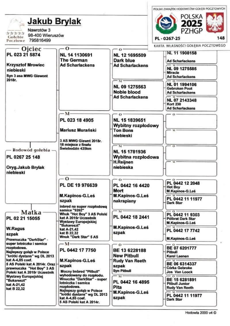 Oryginalny gołąb z hodowli Jakub Brylak. Szczegóły pochodzenia w rodowodzie. Więcej informacji pod nr telefonu. Dostawa gołębi kurierem lub odbiór osobisty.