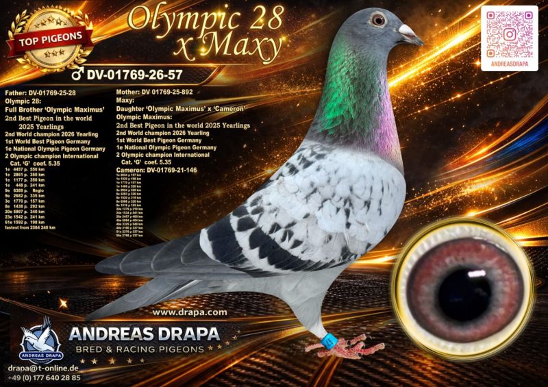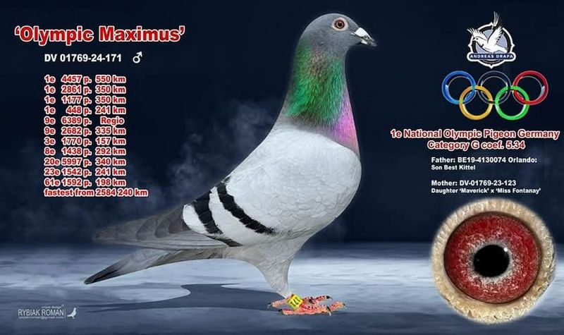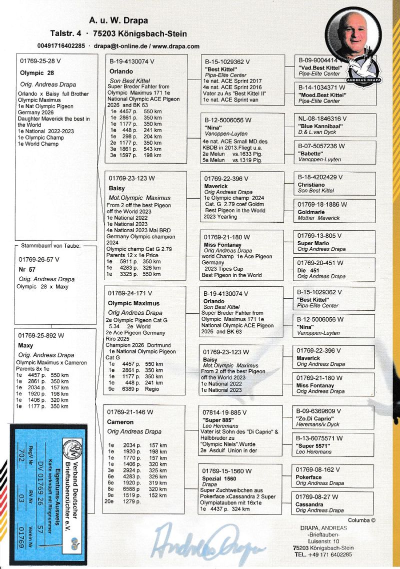 ***UWAGA PODBICOIE NA TEJ AUKCJI WYNOSI 50 ZŁ*** Oryginalny gołąb z hodowli Andreasa Drapy. Szczegóły pochodzenia w rodowodzie. Gołąb jest własnością Andreasa Drapy, a w tej chwili znajduje się już w Polsce u kol. Robert Grochowskiego, gdzie można go obejrzeć przed zakończeniem aukcji po, wcześniejszym kontakcie telefonicznym.
